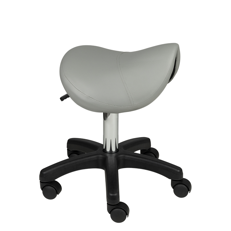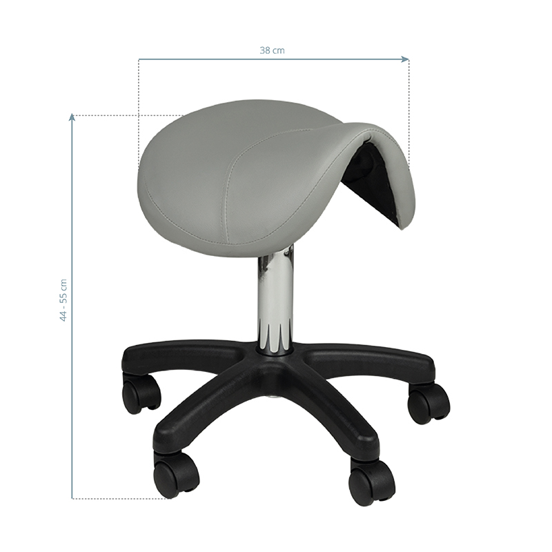Een comfortabele, stabiele Tabouret zonder rugleuning, met een geprofileerde zitting, op een vijfsterrenonderstel met kunststof wielen. zitting van ecoleer in grijs, een onmisbaar meubel in een schoonheidssalon.