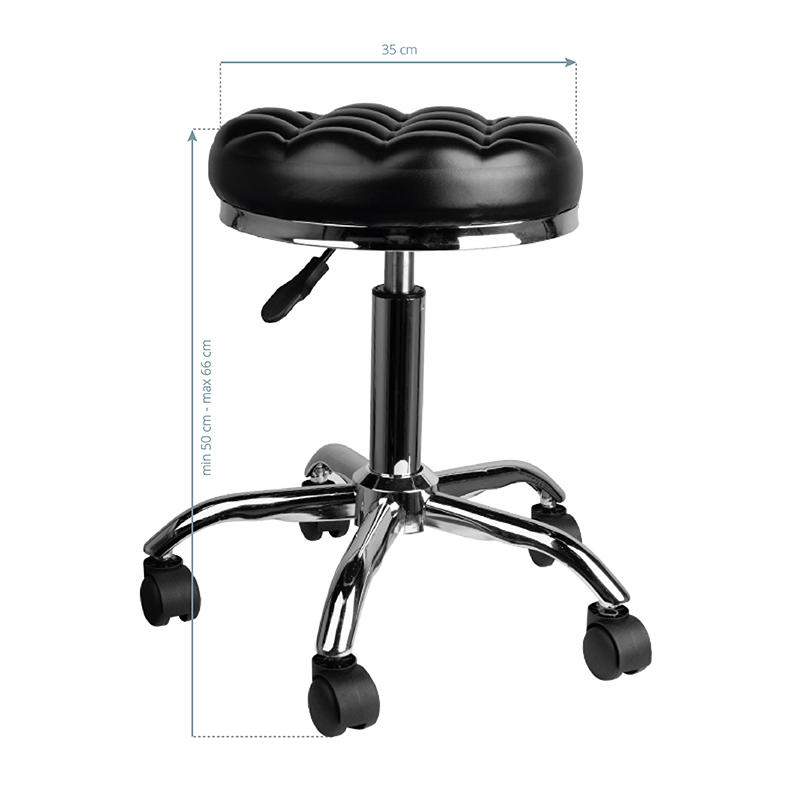 Een comfortabele, stabiele kruk die nodig is in een schoonheidssalon en een kapsalon. de zitting is van polyurethaan en het geheel is gemonteerd op een vijfsteronderstel met kunststof wielen, zwart van kleur.