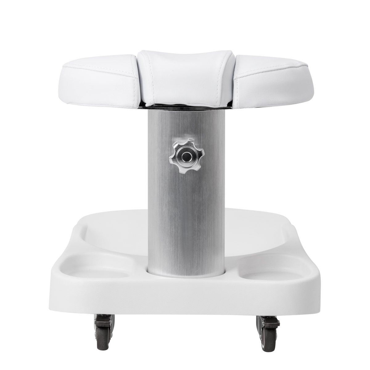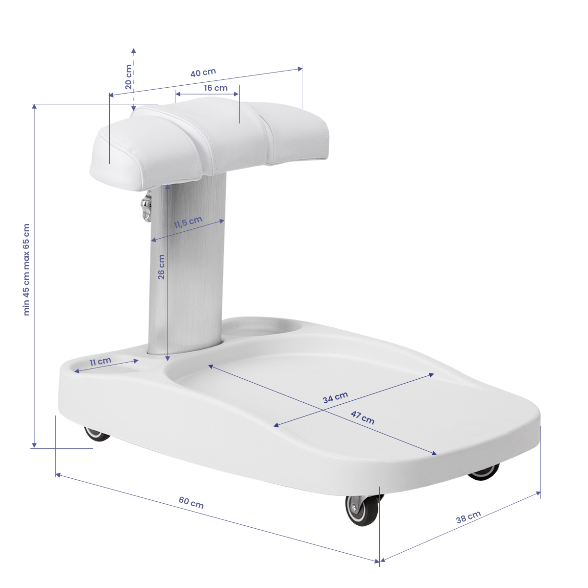 De voetensteun bestaat uit drie delen, waarvan het middelste uitschuifbaar is. Dankzij de handmatige hoogteverstelling kan deze maximaal 20 cm worden verhoogd. Alle elementen van de voetensteun zijn bekleed met kunstleer, wat zorgt voor vochtbestendigheid en eenvoudige reiniging. Hierdoor kan de trolley worden aangepast aan de individuele behoeften van de gebruiker, wat hem een uitstekende oplossing maakt voor zowel cosmetische als podotherapeutische behandelingen, en zorgt voor comfort en precisie bij het werken in verschillende posities.