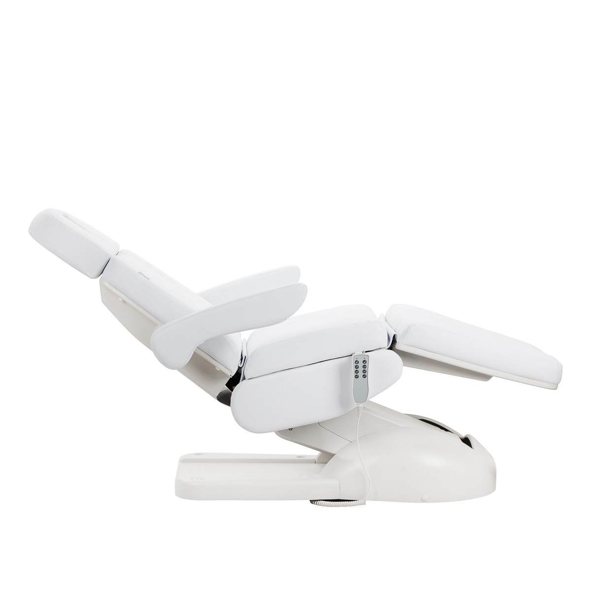 De comfortabele bediening met een bedrade afstandsbediening maakt een nauwkeurige instelling van de stoel in vier niveaus mogelijk: hoogteverstelling, rugleuninghoek, voetensteuninstelling en wiegfunctie. Dit brede verstelbereik maakt het mogelijk om de positie perfect af te stemmen op het type behandeling dat wordt uitgevoerd – zowel wat betreft het comfort van de cliënt als de ergonomie van de specialist. Voor optimaal gebruiksgemak kan de afstandsbediening worden vastgemaakt aan de handgrepen aan beide zijden van de stoel.