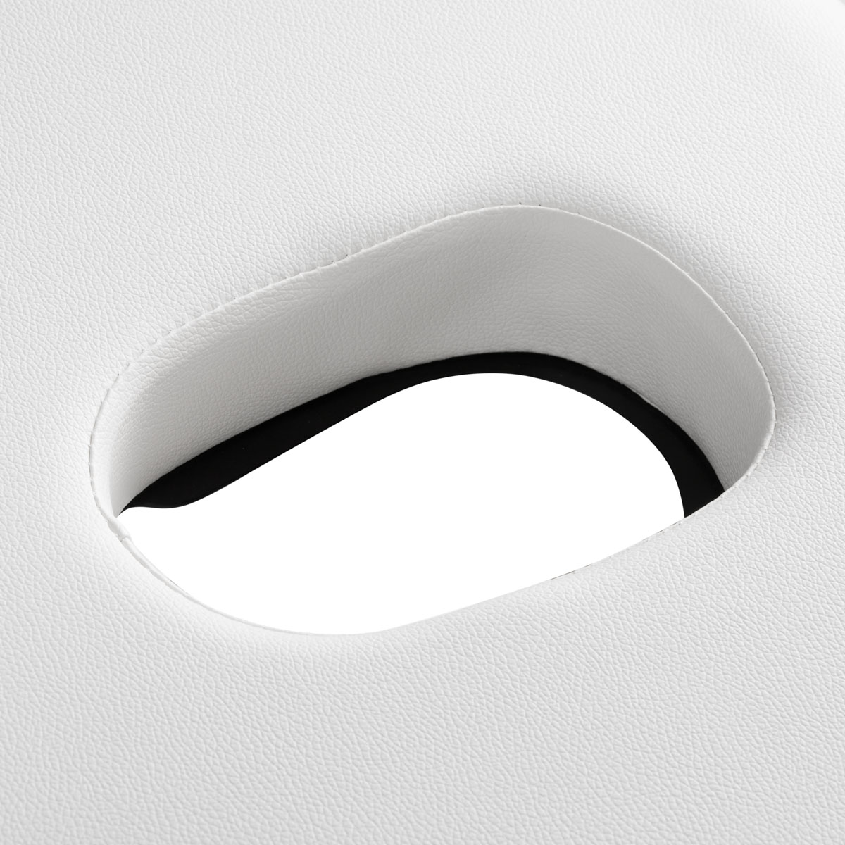 Voor maximaal comfort kan de gebruiker zijn of haar hoofd laten rusten op de ergonomische hoofdsteun, die bij de set is inbegrepen. Dit element is eenvoudig verstelbaar – de hoek kan in twee richtingen worden aangepast, waardoor de positie nauwkeurig kan worden afgestemd op de behoeften van de gebruiker en de aard van de behandeling. Voor therapie op de rug kan de hoofdsteun worden verwijderd via een speciaal gat in het tafelblad.
