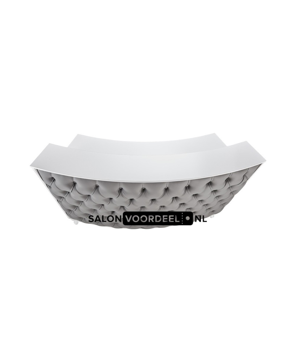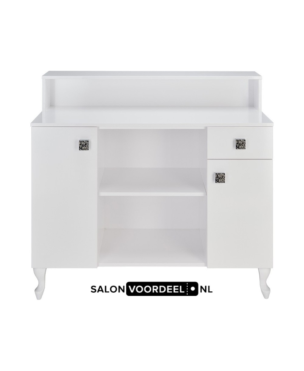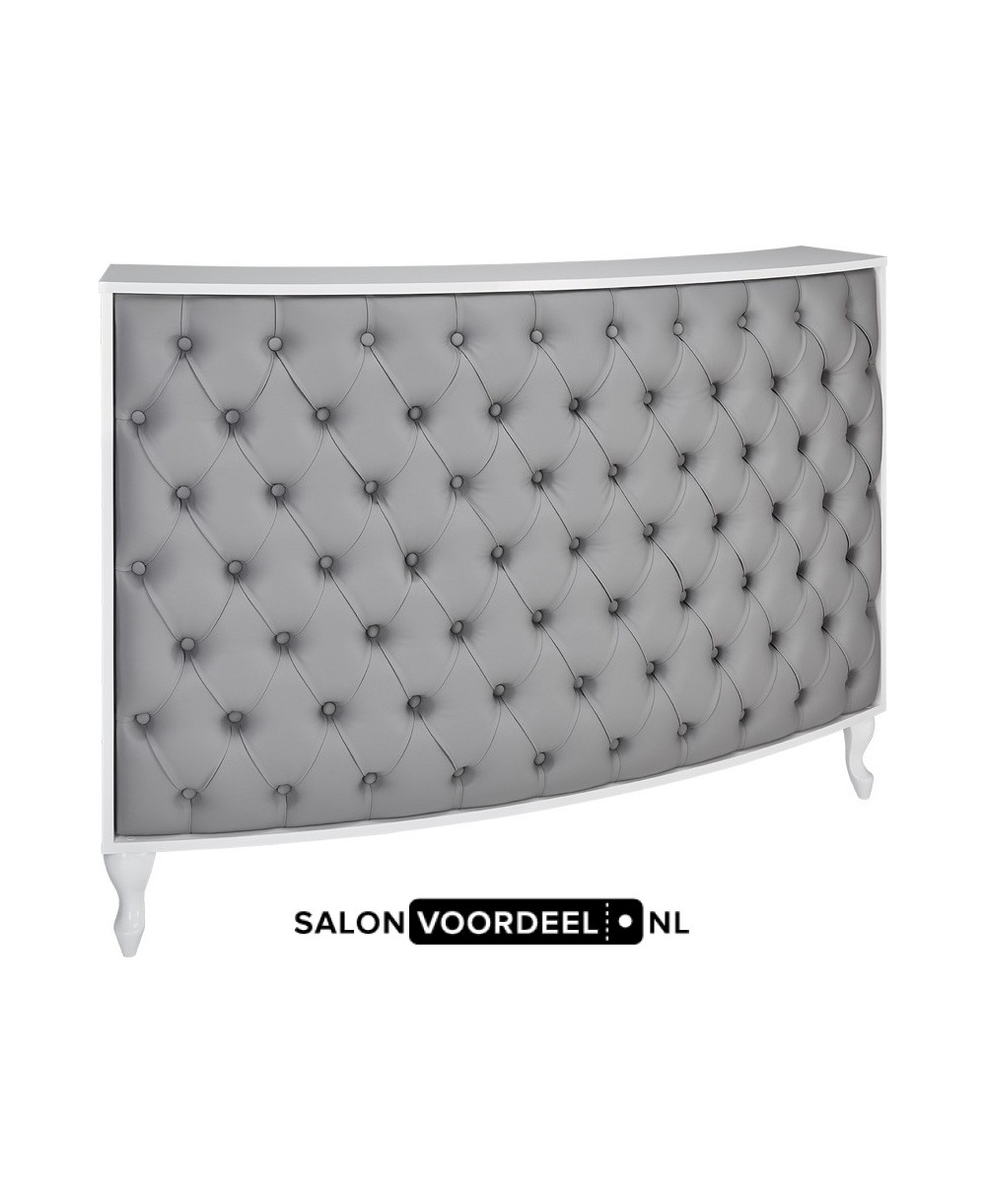 Hét visitekaartje voor uw salon! Verkrijgbaar in 16 kleuren prefinished board. Houten poten. Gestoffeerde voorkant met vulling. Ook verkrijgbaar met afsluitbare lade en kasten.
