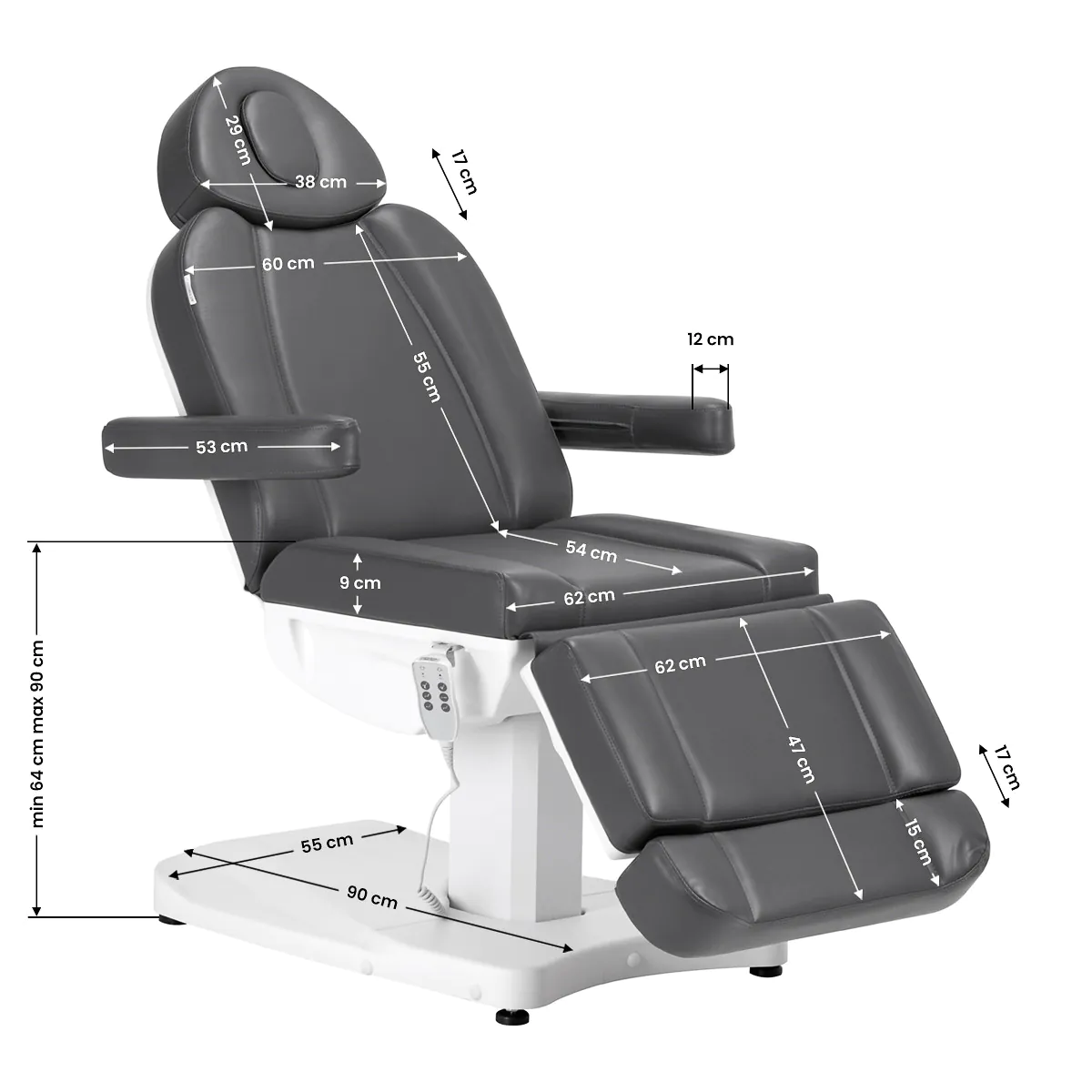 Met behulp van de afstandsbediening kan de stoel < sterk>kan zijn driedimensionaal verstelbaar – de hoogte, de rugleuning en de voetsteun zijn elektrisch verstelbaar. De zitting is in hoogte verstelbaar van 64 tot 90 cm en volledig uitgeschoven bereikt de stoel een lengte van ruim 2 meter. Daarnaast beschikt de stoel over een verstelbare hoofdsteun en voetsteunen (maximale verlenging van beide elementen met +/- 17 cm). Deze afmetingen maken een eenvoudig gebruik van de apparatuur mogelijk door mensen van verschillende lengtes en maken het mogelijk om aangepast te worden aan de behoeften van zowel de cliënt als de persoon die de procedure uitvoert. Dankzij het handvat aan de rechterkant van de stoel kunt u de afstandsbediening zo ophangen dat u deze altijd bij de hand heeft.