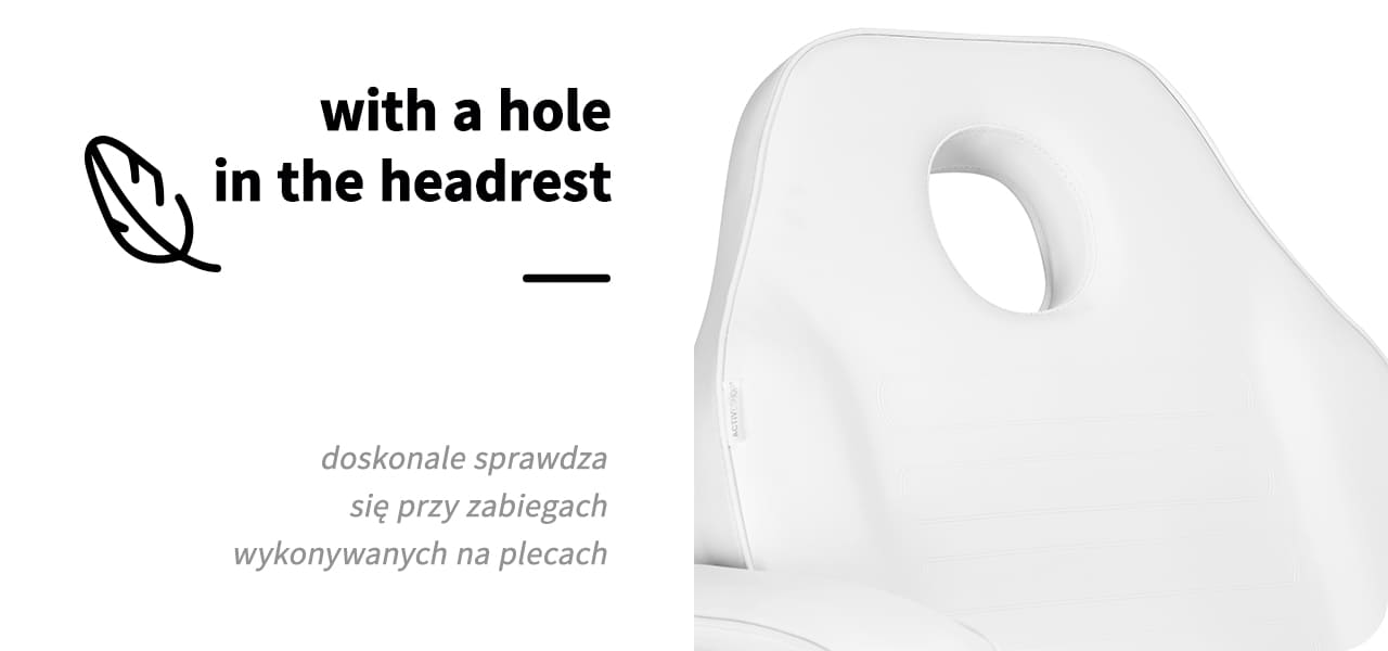Practical plastic cuvettes under the seat provide easy access to the most necessary instruments . The pull-out containers are durable and easy to clean and also help to keep the workplace tidy. Thanks to an opening in the headrest , which is hidden under a well-profiled cushion , the chair is perfect for treatments on the back, such as massages.