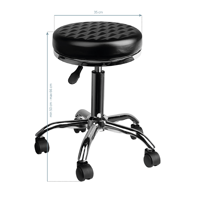 Een comfortabele, stabiele kruk die nodig is in een schoonheidssalon en een kapsalon. de zitting is van polyurethaan en het geheel is gemonteerd op een vijfsteronderstel met kunststof wielen, zwart van kleur.