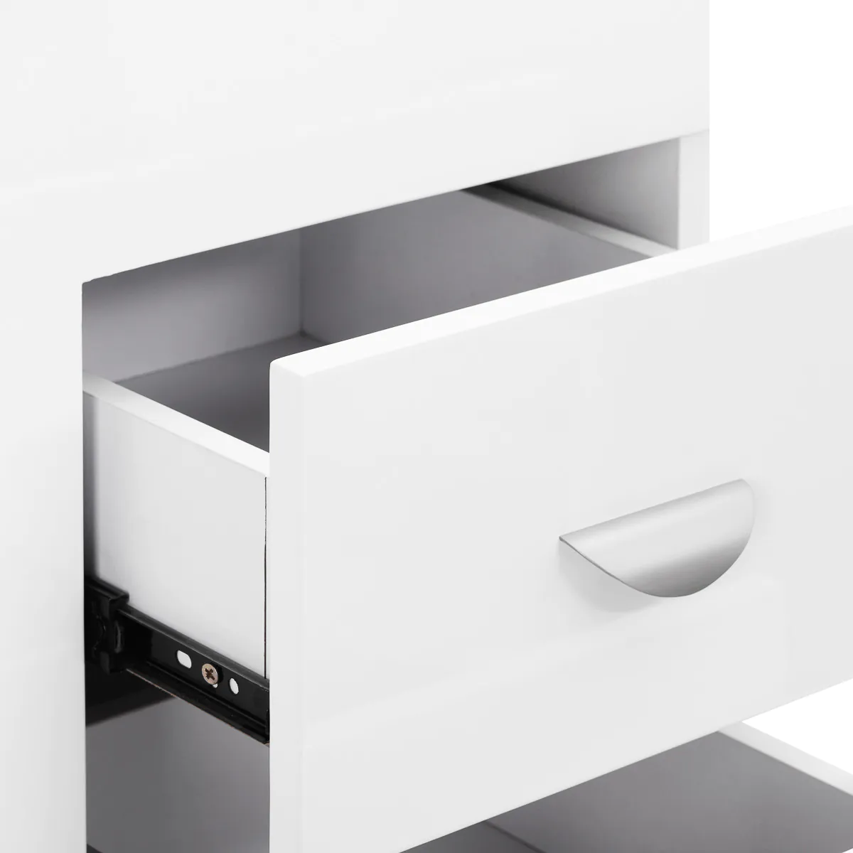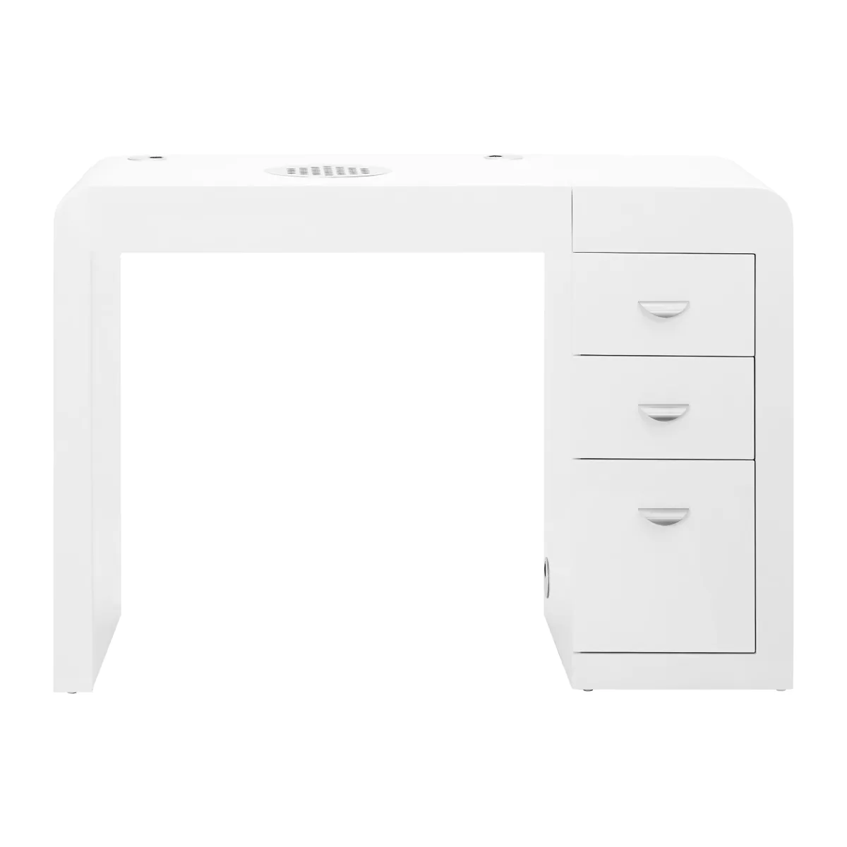 Drie ruim lades maken het gemakkelijker om de meest noodzakelijke cosmetica en gereedschappen op orde te houden. Het manicuretafel en nageltafel is uitgerust met een praktische afzuiging die de hoeveelheid schadelijk stof effectief vermindert, waardoor schone en frisse lucht op de werkplek ontstaat. Tegelijkertijd neemt hij dankzij de integratie in het tafelblad geen waardevolle werkruimte in beslag. Speciaal ontworpen plaatsen voor kabels maken het gemakkelijker om de benodigde apparaten in de salon te ordenen, zoals nagelboormachines, behandellampen of nagellampen, waardoor u de kabels kunt verbergen.
