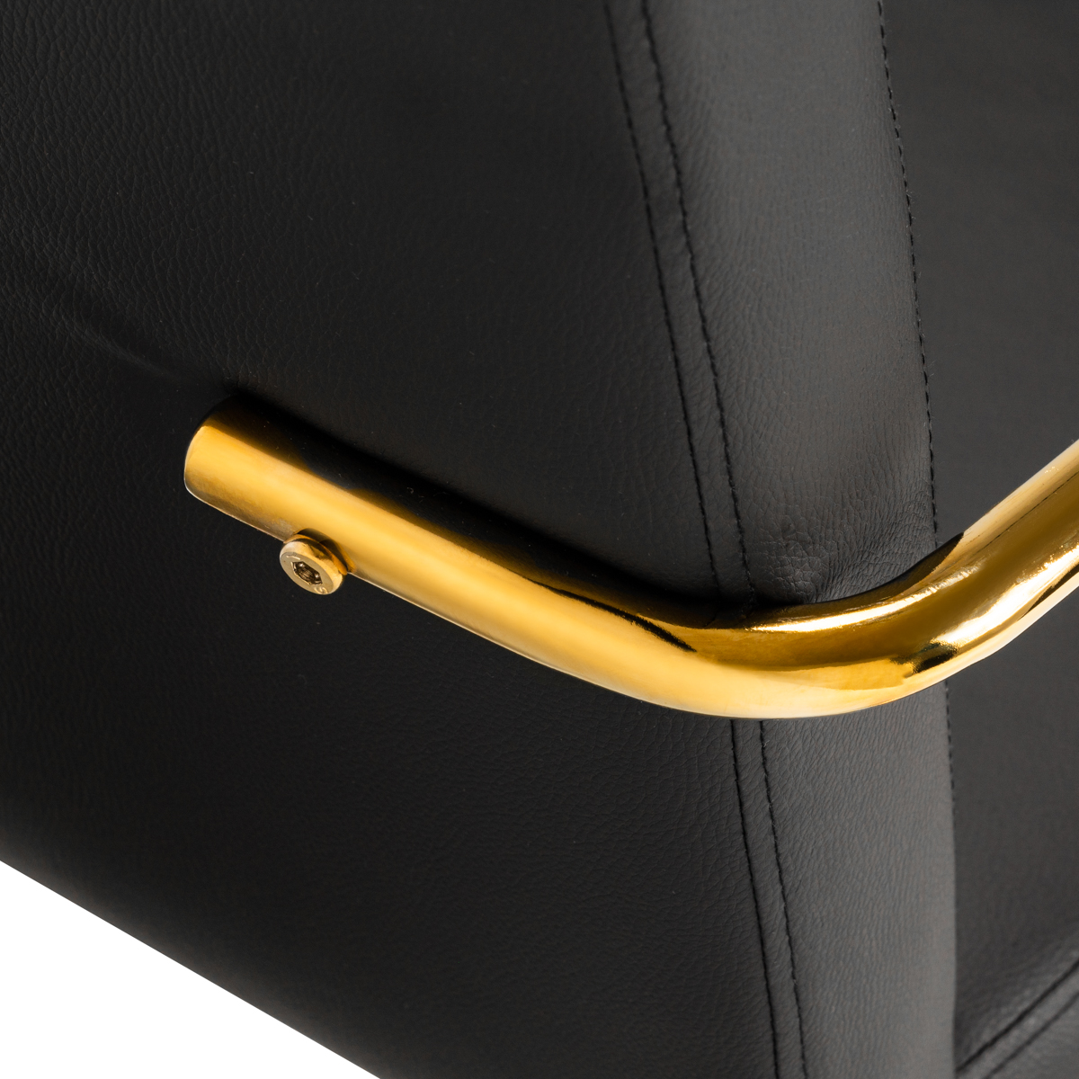 Het aangenaam aanvoelende, kunstlederen bekleding in Zwarttinten geven het meubel een uniek karakter. De elegante afwerking maakt het een echte eyecatcher. Het frame in goudtinten voegt elegantie toe en past perfect bij eenvoudige vormen. Functionele zwenkwielen zorgen voor aanzienlijke mobiliteit, waardoor het gemakkelijker wordt om de stoel te verplaatsen en door de salon te bewegen tijdens het werken. De esthetiek van de afwerking, het gebruiksgemak en de ergonomisch geprofileerde rugleuning zorgen ervoor dat de stoel voldoet aan de eisen van zelfs de meest veeleisende gebruikers.