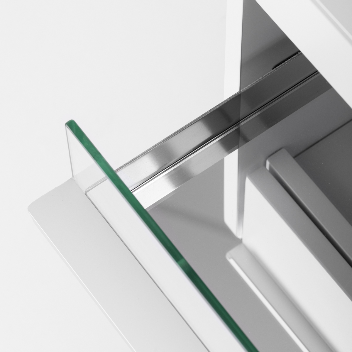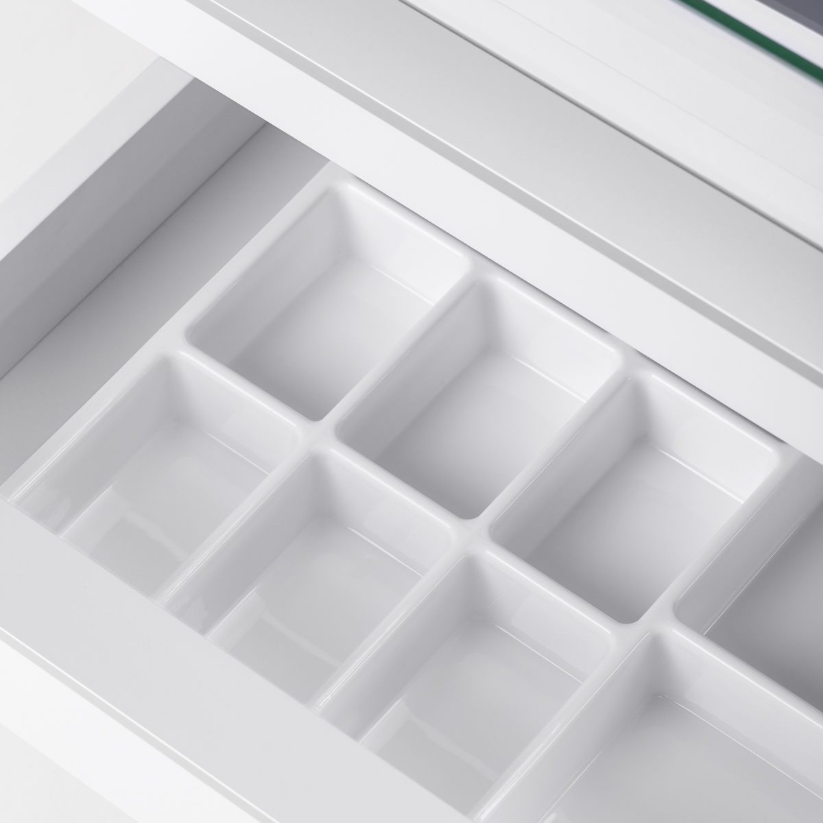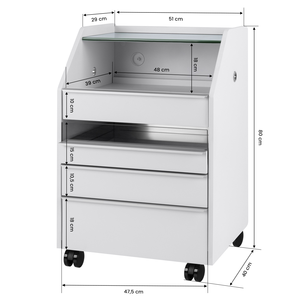 De smalle glazen bovenplank biedt een handige opbergruimte voor de meest gebruikte accessoires. De kast is voorzien van vier lades van verschillende afmetingen, wat de ordelijke opslag van gereedschap en cosmetica vergemakkelijkt. De spiegelende bodem van een van de lades en een speciale interne organizer zorgen voor een betere organisatie van gereedschap, waardoor essentiële accessoires snel toegankelijk zijn en het comfort tijdens behandelingen toeneemt. De hoogte van de bovenste open lade biedt voldoende ruimte voor essentiële apparatuur, zoals een nagelfrees met stofafzuigkap.