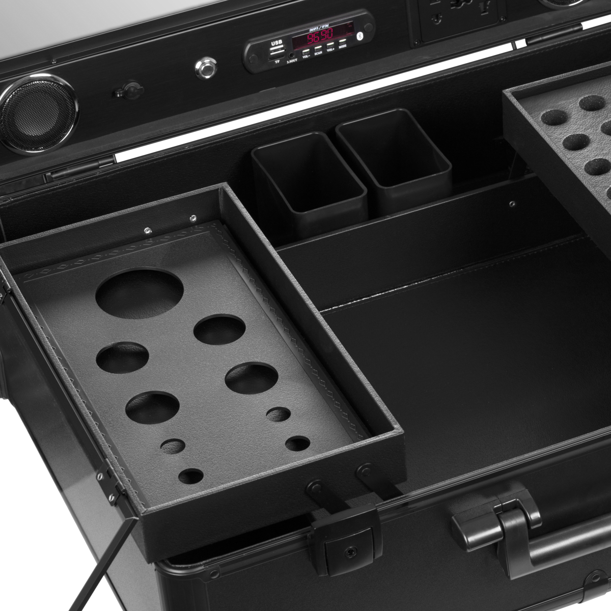Een functionele cosmetische doos in de vorm van een comfortabele, draagbare koffer op wielen. De perfecte oplossing voor mobiele schoonheidsspecialisten of make-upartiesten. Zeer ruim. Het heeft vier telescopische benen, waarmee we de hoogte van het station goed kunnen aanpassen. Verlichting aan de zijkanten van de spiegel. In de kofferbak vindt u ook een Radio Met -luidsprekers, USB en Bluetooth en opvouwbare planken voor kleine accessoires. Zwart kleur.
