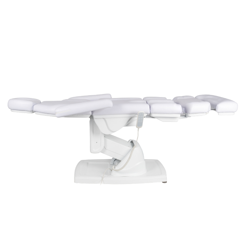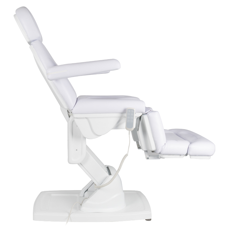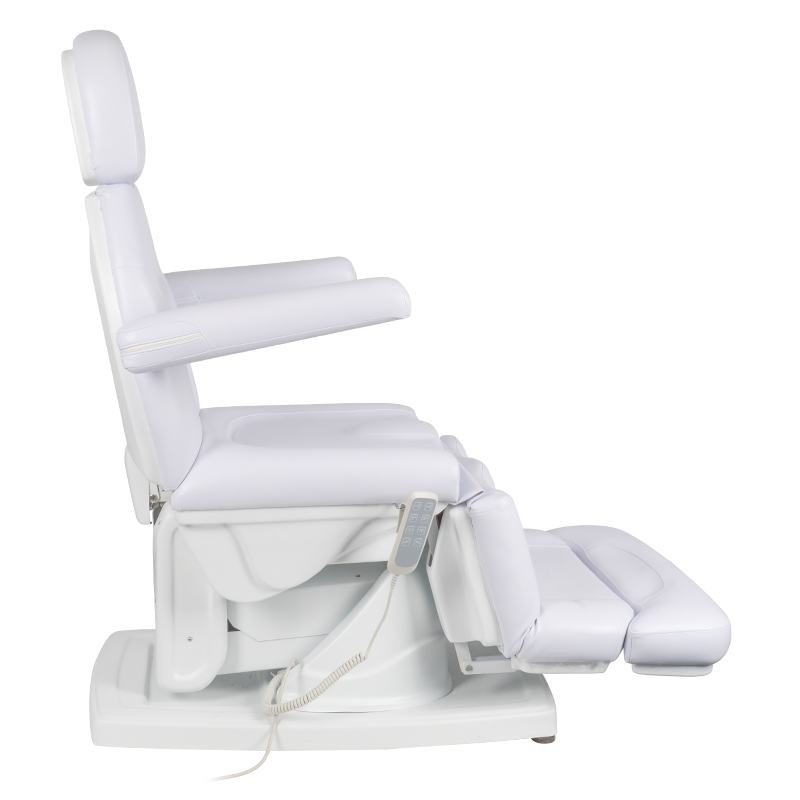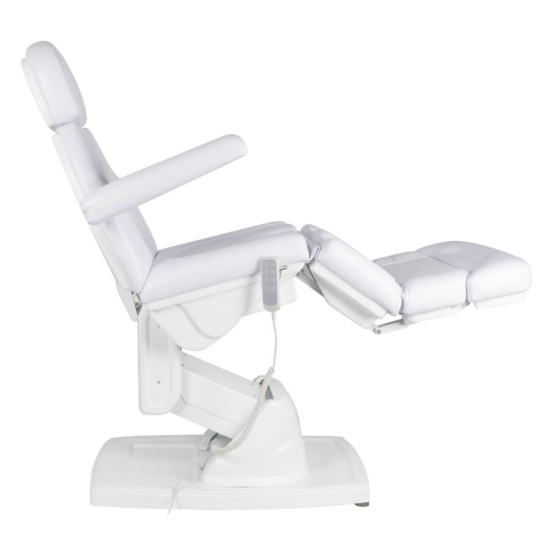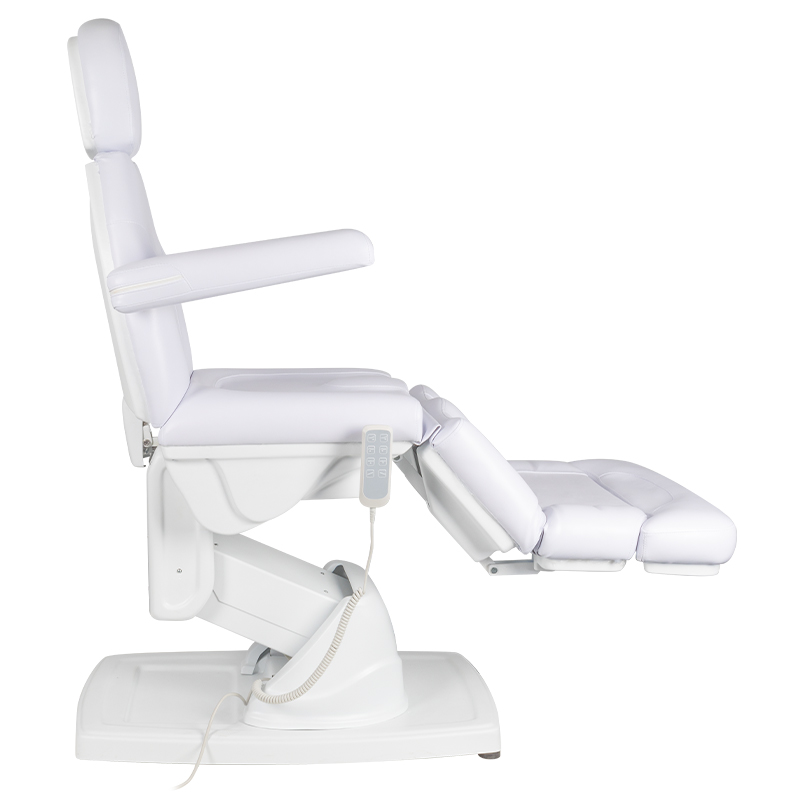 moderne elektrisch verstelbare cosmetische behandelstoel, die comfort tijdens de behandeling garandeert, niet alleen voor de patiënten maar ook voor de personen die de procedure uitvoeren. 4 stille elektromotoren maken een snelle en gemakkelijke verstelling van de stoel via de afstandsbediening mogelijk. Optioneel is het mogelijk om een ​​voetschakelaar aan te sluiten, code 133026. De stoelen hebben een voorgevormde en zeer comfortabele zit, zijn duurzaam en zeer stabiel. het speciale ontwerp van de voetsteun vergemakkelijkt pedicure- en podotherapiebehandelingen. omhoog-omlaag verstelbereik waardoor de stoelhoogte individueel kan worden aangepast aan de lengte van de persoon die de procedure uitvoert en het type behandeling – modern design en functionaliteit in één. 150*80*60