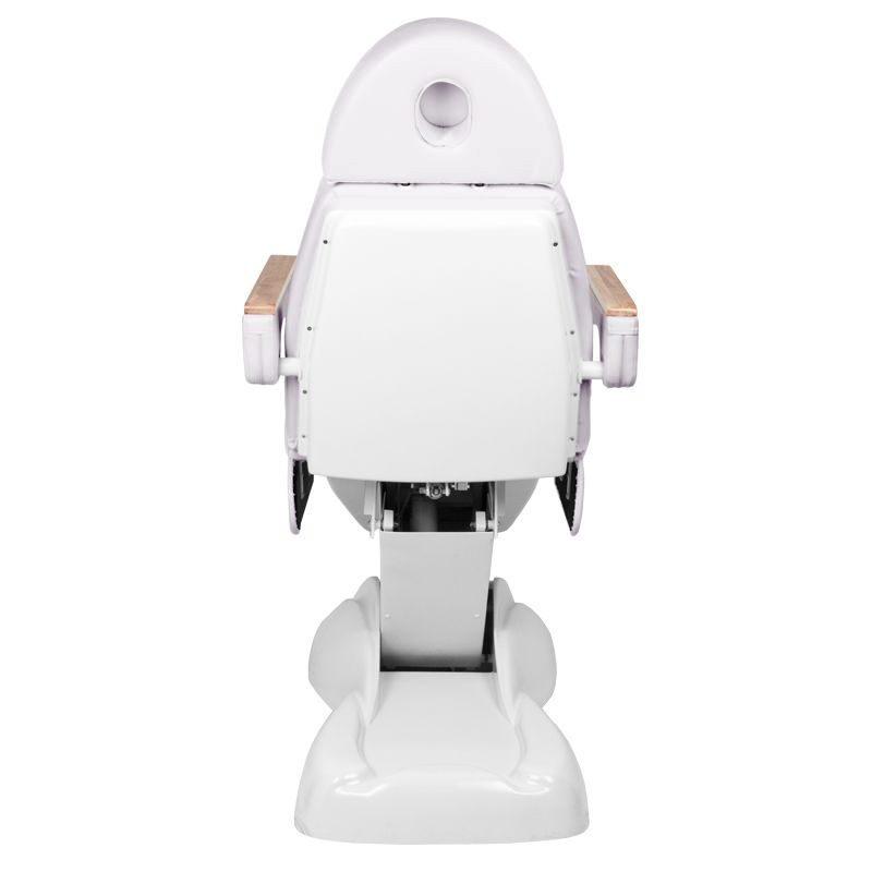 De stoel is gevuld met schuim van de juiste hardheid en bedekt met aangenaam aanvoelend kunstleer in wittinten. Dankzij het gebruik van een materiaal dat gemakkelijk schoon te houden en bestand is tegen geselecteerde desinfectiemiddelen, is de apparatuur comfortabel in gebruik, bestand tegen vocht en gemakkelijk schoon te maken. Een stevige basis gemaakt van duurzaam materiaal in wittintenzorgt voor stabiliteit tijdens behandelingen. Decoratieve houten elementen op de armleuningen onderscheiden de stoel van andere modellen en vormen een visueel aantrekkelijk, elegant accent. Goed geprofileerde zomen geven de stoel een stijlvolle uitstraling en maken de zitting ergonomisch.
