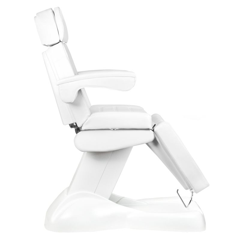 De fauteuil is gevuld met schuim van geschikt stevigheid en het oppervlak is bedekt met een aangenaam aanvoelend kunstleer in witte tinten. Het afdekmateriaal is gemakkelijk schoon te houden en bestand tegen geselecteerde desinfectiemiddelen, wat gebruikscomfort en duurzaamheid tegen vocht garandeert. Een stevige basis van duurzaam materiaal in wittinten zorgt voor stabiliteit tijdens behandelingen. Zorgvuldig gevormde ergonomische zomen geven de stoel een stijlvolle uitstraling en bieden comfort.