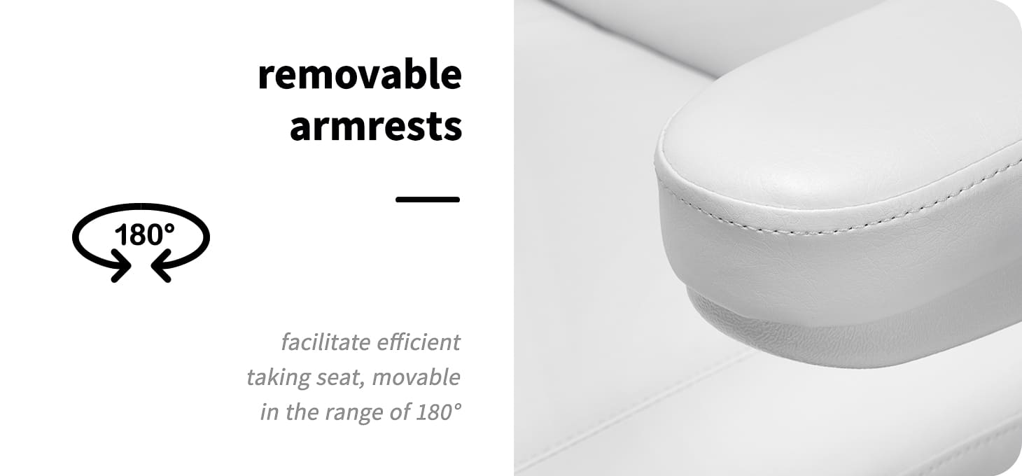 De uitschuifbare hoofdsteun helpt de uitrusting aan te passen aan de behoeften van gebruikers van verschillende lengtes, waardoor stabiele hoofdsteun tijdens behandelingen. Het is ook mogelijk om de verlenging van de voetsteun aan te passen, wat vooral handig is tijdens behandelingen bij langere mensen, waardoor ze betere ondersteuning krijgen. De armleuningen zijn binnen 180º beweegbaar, waardoor het gemakkelijker wordt om plaats te nemen in de stoel en een comfortabele toegang biedt voor de persoon die de procedure uitvoert. Ze kunnen indien nodig gemakkelijk en snel worden verwijderd.