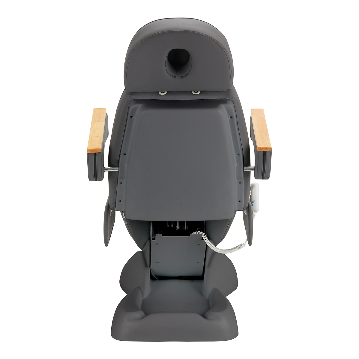 De stoel is gevuld met schuim van de juiste hardheid en bedekt met aangenaam aanvoelend kunstleer in grijstinten. Dankzij het gebruik van een materiaal dat gemakkelijk schoon te houden en bestand is tegen geselecteerde desinfectiemiddelen, is de apparatuur comfortabel in gebruik, bestand tegen vocht en gemakkelijk schoon te maken. Een stevige basis gemaakt van duurzaam materiaal in grijstinten zorgt voor stabiliteit tijdens behandelingen. Decoratieve houten elementen op de armleuningen onderscheiden de stoel van andere modellen en vormen een visueel aantrekkelijk, elegant accent. Goed geprofileerde zomen geven de stoel een stijlvolle uitstraling en maken de zitting ergonomisch.