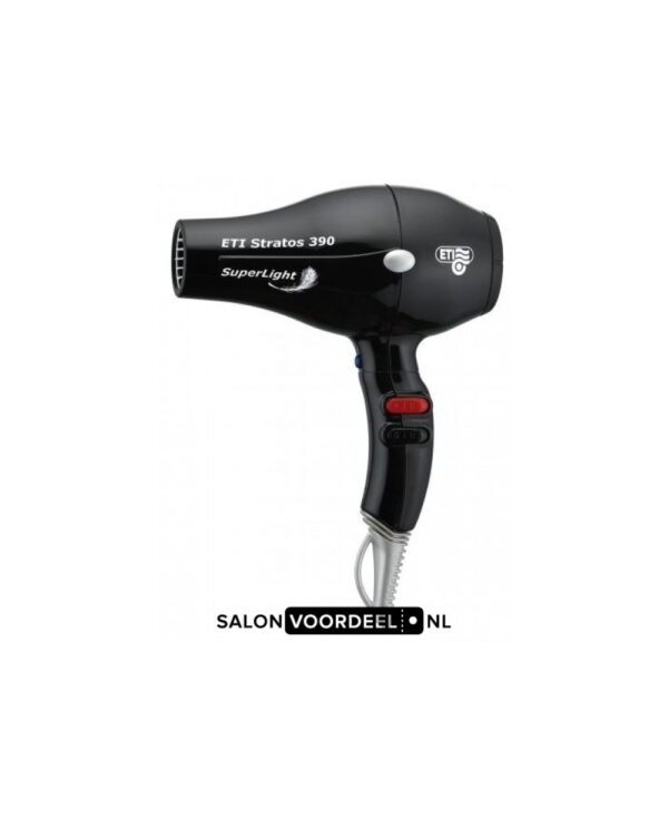 Föhn ETI Stratos 390 SuperLight zwart De ETI Stratos 390 SuperLight zwart is een professionele haardroger voor gebruik in de salon. Dankzij de krachtige motor is het haar in no-time droog. Hierdoor is deze föhn zeer efficiënt in gebruik. Deze haardroger is verkrijgbaar in verschillende kleuren: zwart, roze, paars en wit. Welke kleur past bij jou? De Stratos 390 SuperLight weegt slechts 485 gram en is door het lichte gewicht zeer comfortabel in gebruik. De krachtige AC motor van 2200 watt heeft een levensduur van minimaal 2000 draaiuren.