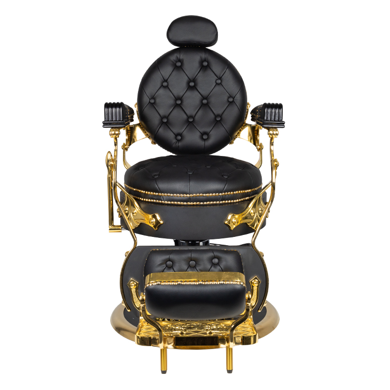 Gabbiano Barberstoel Cesare Goud/Zwart Als jouw salon baardverzorging biedt, kunnen wij de perfecte barberstoel voor jouw barbersalon aanbieden. De barberstoel Cesare. Een comfortabele fauteuil met een breed scala aan aanpassingen zorgt voor maximaal comfort voor zowel de persoon die de behandeling uitvoert als de salonklant. Niet alleen is de hoogte in de fauteuil in te stellen, maar ook de helling van de rugleuning is gemakkelijk in te stellen en zelfs de voetsteun en de lengte van de bedsteun. De barberstoel Cesare is niet alleen comfortabel en gemakkelijk te verstellen, maar beschikt ook over een uiterst stijlvol design. De stoel past perfect in het interieur dat in de oude stijl is ingericht. Perfect afgewerkt. Zelfs de kleinste details worden met grote precisie gemaakt. Prachtige bekleding met originele textuur. Hoogwaardig eco-leer, slijtvast en gemakkelijk te onderhouden. Een zware gietijzeren voet geeft het meubel een perfecte stabiliteit, zelfs onder zware belasting.