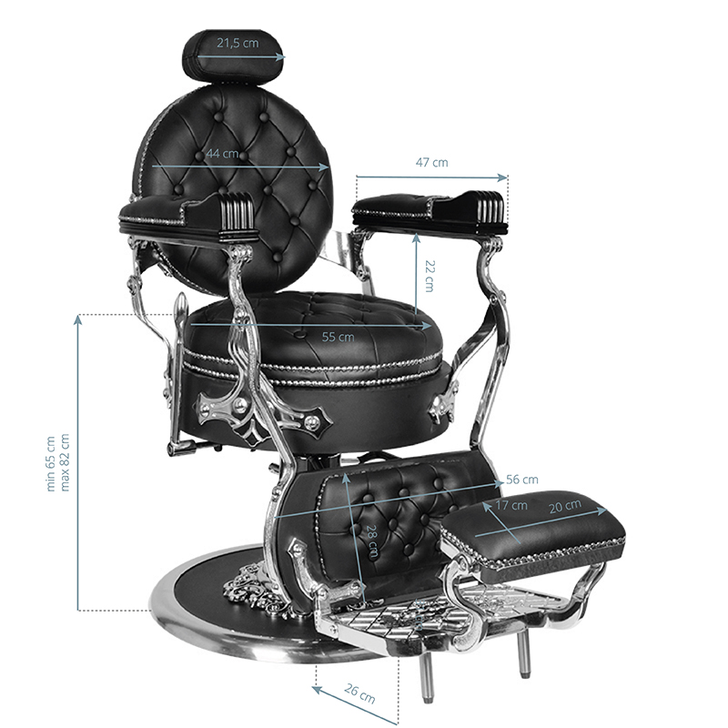 Gabbiano Barberstoel Cesare Zilver/Zwart Als jouw salon baardverzorging biedt, kunnen wij de perfecte barberstoel voor jouw barbersalon aanbieden. De barberstoel Cesare. Een comfortabele fauteuil met een breed scala aan aanpassingen zorgt voor maximaal comfort voor zowel de persoon die de behandeling uitvoert als de salonklant. Niet alleen is de hoogte in de fauteuil in te stellen, maar ook de helling van de rugleuning is gemakkelijk in te stellen en zelfs de voetsteun en de lengte van de bedsteun. De barberstoel Cesare is niet alleen comfortabel en gemakkelijk te verstellen, maar beschikt ook over een uiterst stijlvol design. De stoel past perfect in het interieur dat in de oude stijl is ingericht. Perfect afgewerkt. Zelfs de kleinste details worden met grote precisie gemaakt. Prachtige bekleding met originele textuur. Hoogwaardig eco-leer, slijtvast en gemakkelijk te onderhouden. Een zware gietijzeren voet geeft het meubel een perfecte stabiliteit, zelfs onder zware belasting.