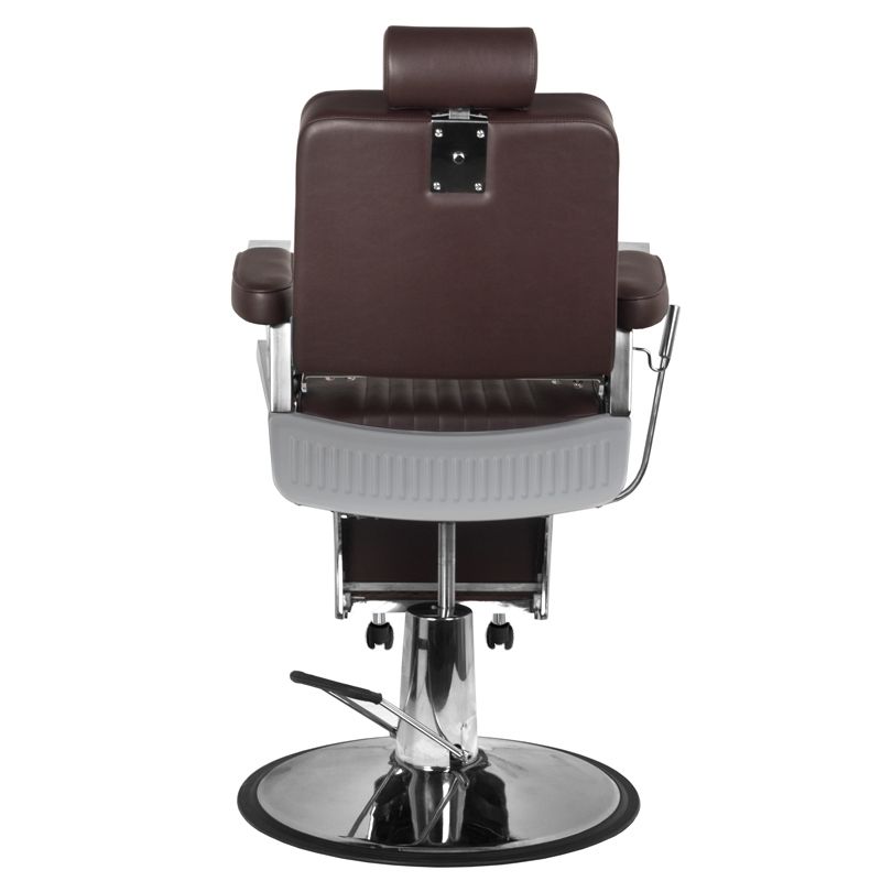 Gabbiano Barberstoel Royal Bruin De barberstoel Royal is een moderne, perfect afgewerkte barberstoel die de klant het maximale gevoel van comfort bied tijdens de uitgevoerde behandelingen. De barberstoel heeft behalve de up-down verstelling ook een verstelbare rugleuning en een verstelbare voetensteun. Ondanks de kleine afmetingen is het mogelijk om de cliënt in een gemakkelijke, liggende positie te plaatsen. De comfortabele zitting is bekleed met hoogwaardig eco-leer. Een brede, chromen voet garandeert de stabiliteit van het meubel tijdens het gebruik. Een bijkomend voordeel is de gemakkelijke verstelling van de hoofdsteun.
