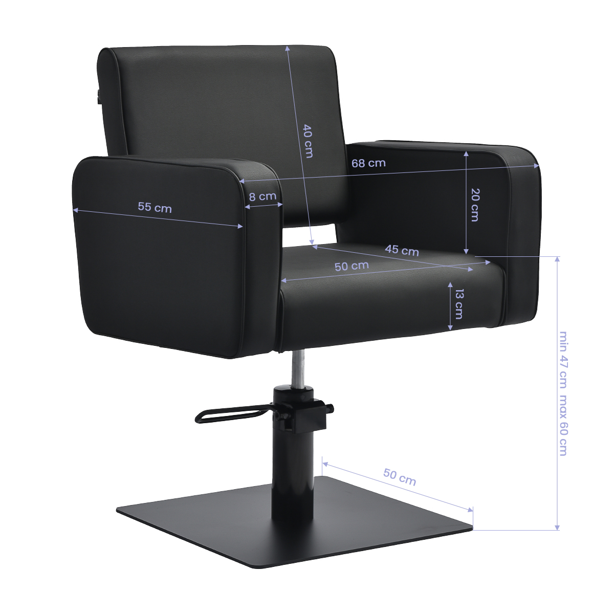 De duurzame hydraulische lift zorgt voor een soepele zithoogteverstelling van 47 tot 60 cm – zelfs wanneer de klant in de stoel zit. Dit maakt het werk ergonomischer en de positie kan eenvoudig worden aangepast aan de lengte van zowel de klant als de kapper. De comfortabele rugleuning biedt stabiele rugondersteuning en bevordert een comfortabele houding, wat vooral belangrijk is tijdens lange behandelingen, en verhoogt het comfort en de tevredenheid van de klant.