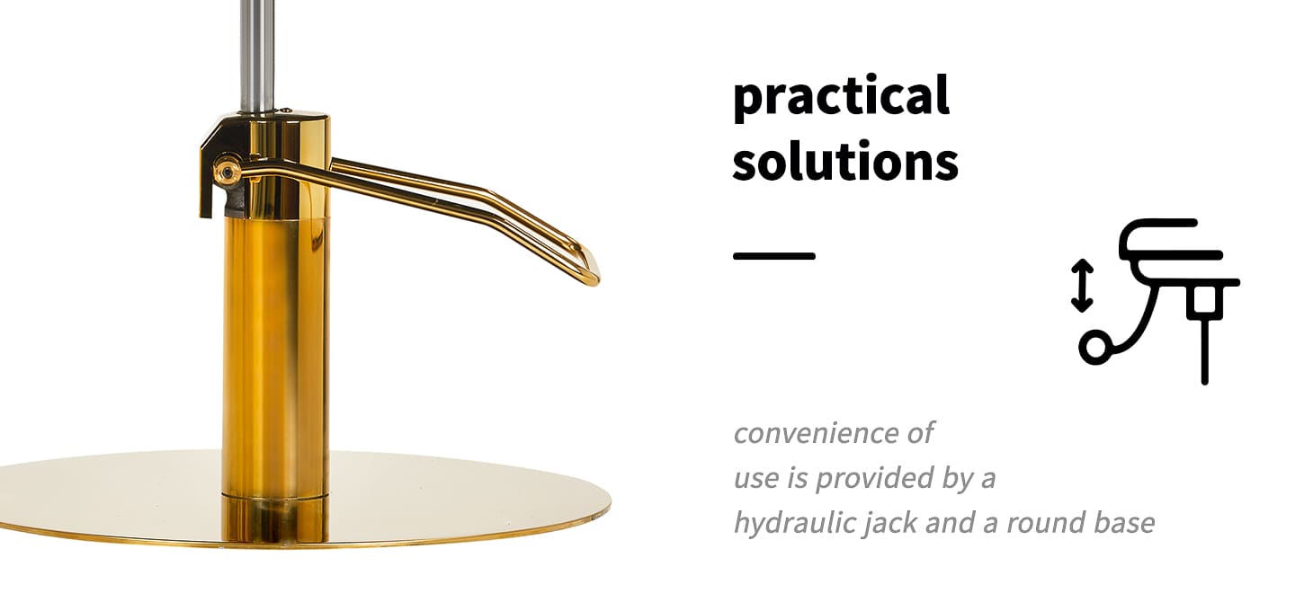 Een duurzame hydraulische lift zorgt ervoor dat de hoogte kan worden aangepast binnen 54- 71 cm, zelfs als de klant op de stoel zit. Dit garandeert meer ergonomisch werken, dankzij de mogelijkheid om het zitniveau aan te passen aan de lengte van zowel de klant als de kapper. De goed geprofileerde, afgeronde rugleuning maakt het mogelijk een comfortabele houding aan te nemen, wat vooral belangrijk is bij urenlange behandelingen. Een belangrijk pluspunt is de chique voetensteun, passend bij dit model, die een stabiele ondersteuning biedt aan de voeten van de gebruiker.