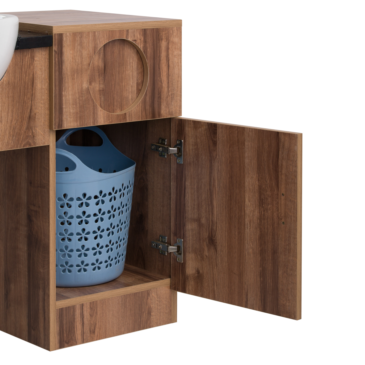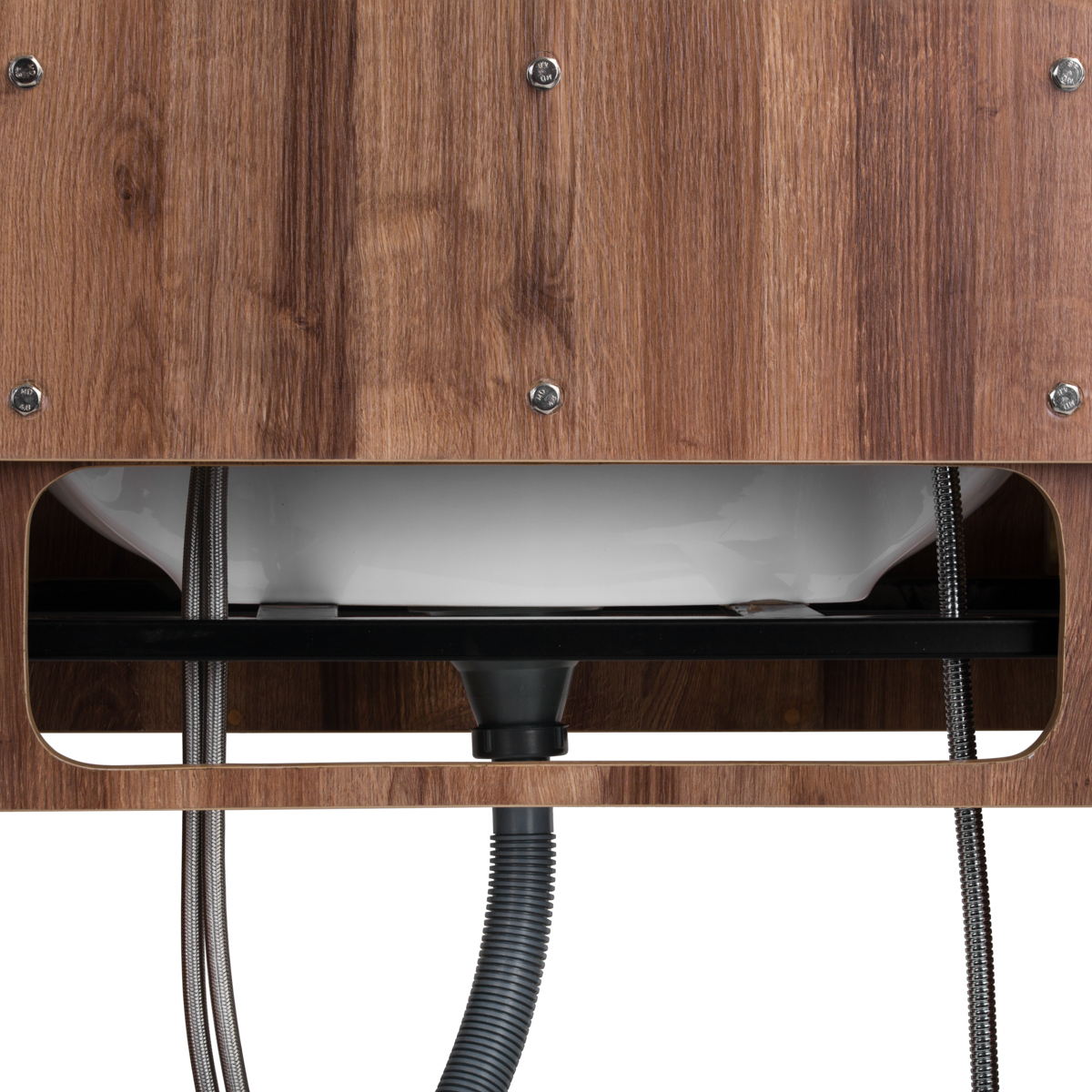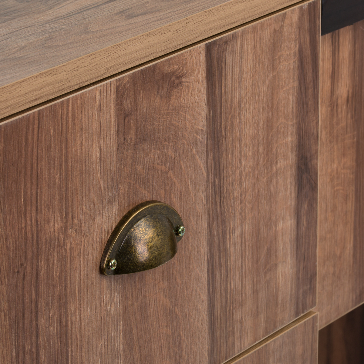 Een moderne Bruin -kappersconsole ontmoette koperen afwerkingen. Een grote spiegel, gootsteen, laden en hangkasten zorgen voor functionaliteit. Topklasse afwerking. Een elegant en tegelijkertijd universeel element van het interieur dat het karakter van elke woonkamer zal benadrukken.