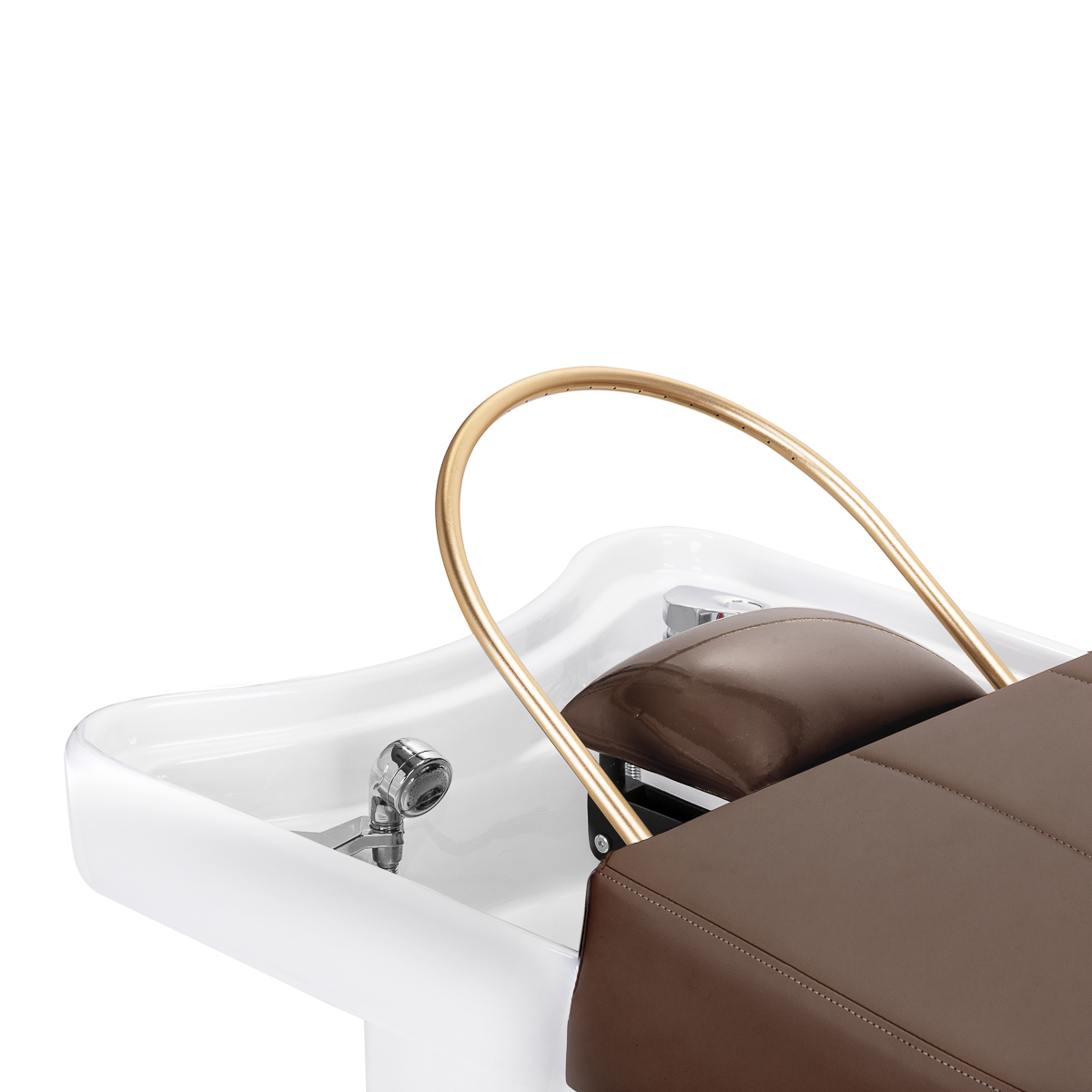 De diepe keramische kom in witte tinten voorkomt effectief spatten van water en producten tijdens behandelingen, waardoor hygiëne en werkcomfort worden gewaarborgd. De unieke kromming vergemakkelijkt niet alleen de toegang voor de behandelaar, maar geeft de wasunit ook een elegant, modern karakter. De kom is gemaakt van duurzaam materiaal en is bestand tegen verkleuring, krassen en beschadigingen. Dankzij het gladde oppervlak is de kom bovendien zeer gemakkelijk schoon te maken. De combinatie van functionaliteit en esthetiek verhoogt de standaard van elke professionele ruimte. Doordachte voorzieningen en accessoires. De haarwasunit is voorzien van een mengkraan, waarmee de temperatuur eenvoudig naar wens van de klant kan worden aangepast. Een speciale plek voor de douchekop maakt het werk gemakkelijker, en een chromen stop met een speciaal filter zorgt voor een goede waterstroomregeling en garandeert een hoge hygiëne in de salon. De wateraansluiting bevindt zich in de basis, waardoor alle leidingen netjes weggewerkt kunnen worden. De loungestoel is zo ontworpen dat hij comfortabel is tijdens diverse behandelingen. De combinatie van functionaliteit en comfort maakt werken in een kapsalon of spa nog aangenamer.