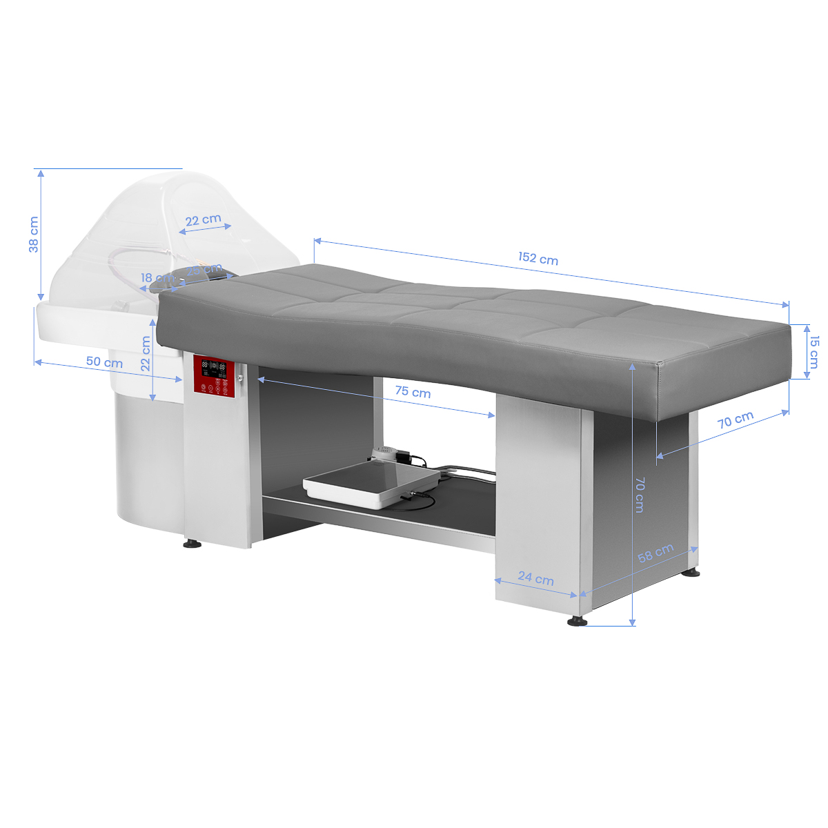 De Head Spa 017 Elektrische SPA-ligstoel combineert functionaliteit met een modern design. Uitgerust met een stevig roestvrijstalen frame, garandeert deze stabiliteit en duurzaamheid. De ergonomisch gevormde ligstoel is bekleed met zacht synthetisch leer in grijstinten, wat zorgt voor maximaal comfort tijdens behandelingen. Bovendien biedt de ruimte onder de ligstoel handige opbergmogelijkheden voor cosmetica en accessoires, waardoor het een uitstekende keuze is voor professionele schoonheidsspecialisten.