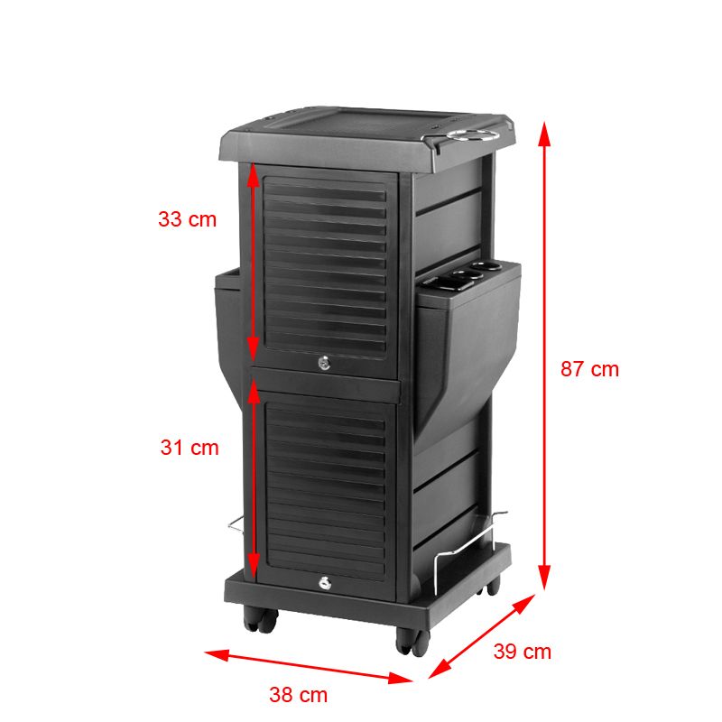 zwarte Werkwagen kapper trolley met 2 afsluitbare sleutelluiken, 4 kattenbakken en 15 vakken voor kappersassortiment. stabiele constructie zorgt voor langdurig gebruik. tafel op wielen, waardoor het gereedschap altijd bij de hand is. helper met onderdelen voor zelfmontage. afmetingen verpakking 81 * 23 * 40