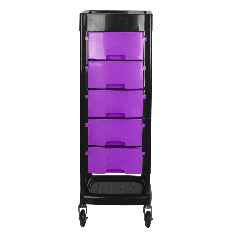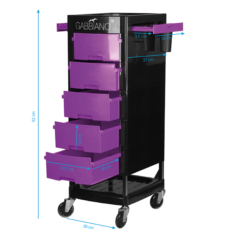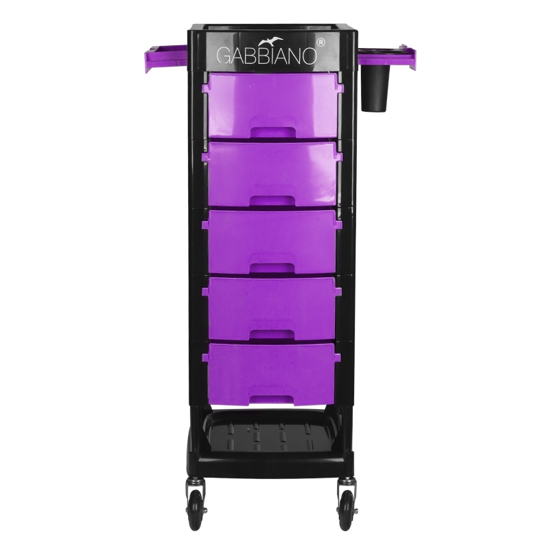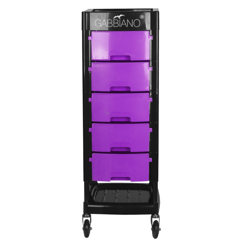 Gabbiano kappers werkwagen ft65 zwart/paars De kappers werkwagen van Gabbiano is een meubel van hoge kwaliteit. Het is gemaakt van duurzaam ABS-materiaal met een stalen framestructuur die zorgt voor hoge stabiliteit en duurzaamheid. het geheel is gemonteerd op zeer duurzame kogelgelagerde rubberen wielen. de dominante zwarte kleur, gebroken met de kleur van de lades, past perfect bij de inrichting van je woonkamer!