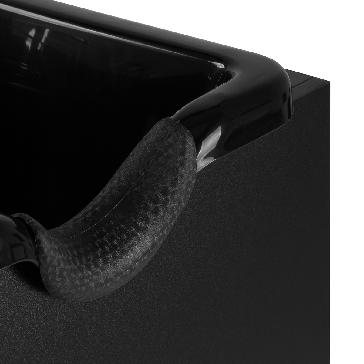 De diepe, zwarte kom is gemaakt van duurzaam kunststof, waardoor hij bestand is tegen beschadigingen en gemakkelijk schoon te houden is. Het doordachte ontwerp vermindert effectief het spetteren van water en preparaten tijdens het wassen. De ergonomische vorm en de geprofileerde kraag met siliconen hoes zorgen voor een comfortabele hoofdpositie. Een praktische plek voor de handdouche zorgt voor een betere organisatie van het station, en de stop met zeef maakt het gemakkelijker om de waterstroom te regelen en de netheid en hygiëne te behouden.