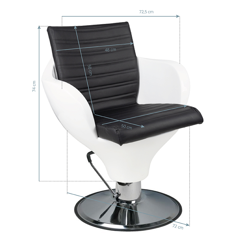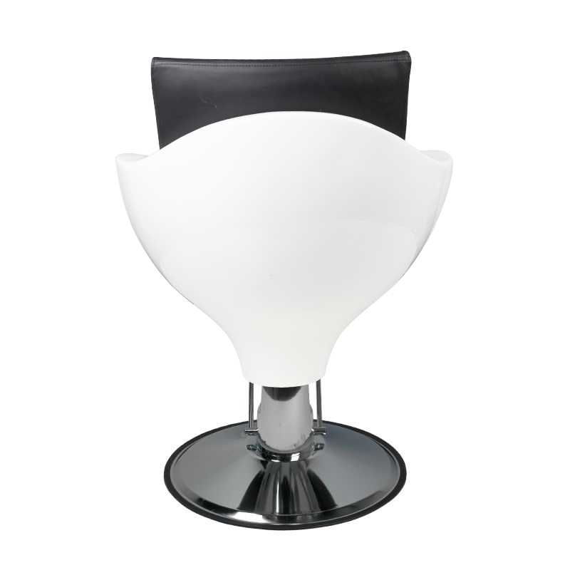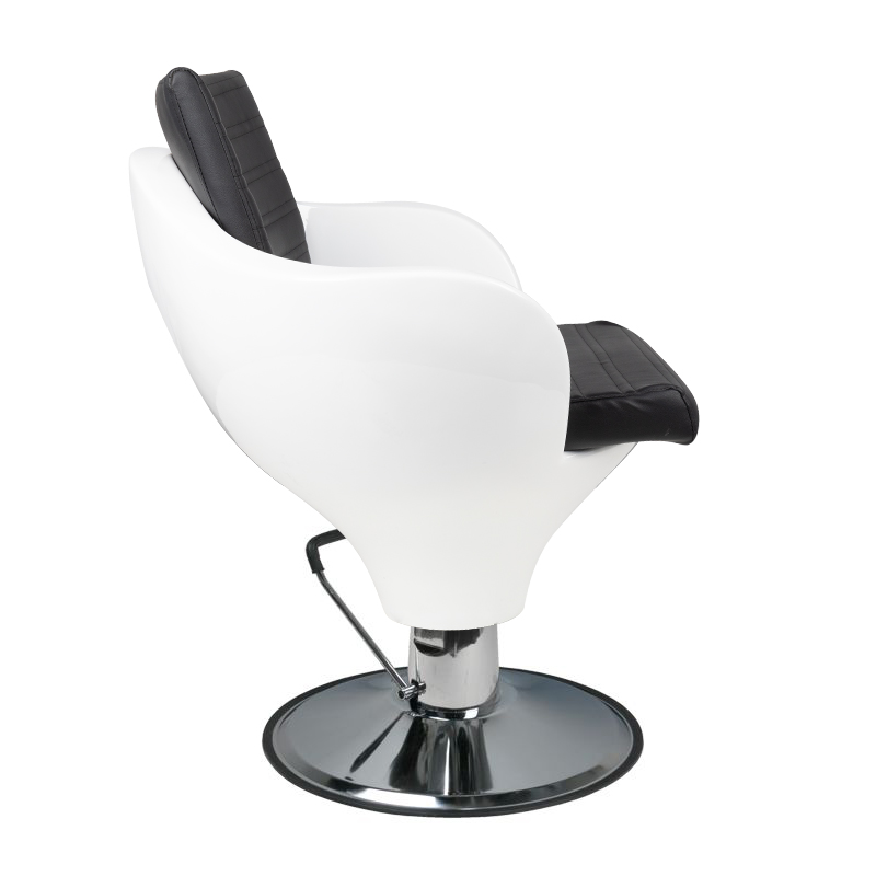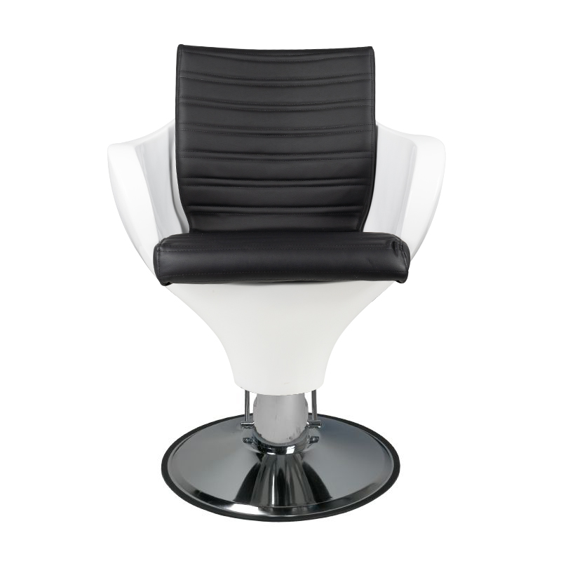 Moderne kappersstoel met een uniek design. De structuur van de kappersstoel is gemaakt van kunststof, hoogglans gelakt. Zeer comfortabel, bij uitstek geschikt voor moderne salons. Speciaal gevormd om de cliënt een comfortabele houding te geven tijdens de behandeling. De stoel is in de hoogte verstelbaar. Zeer stabiel en solide. Bekleding gemaakt van hoogwaardig zwart eco-leer.