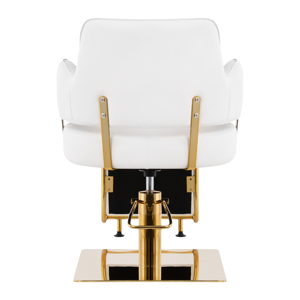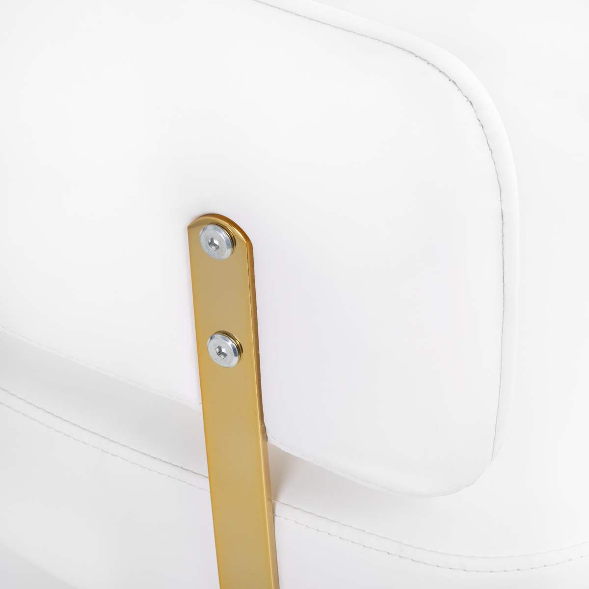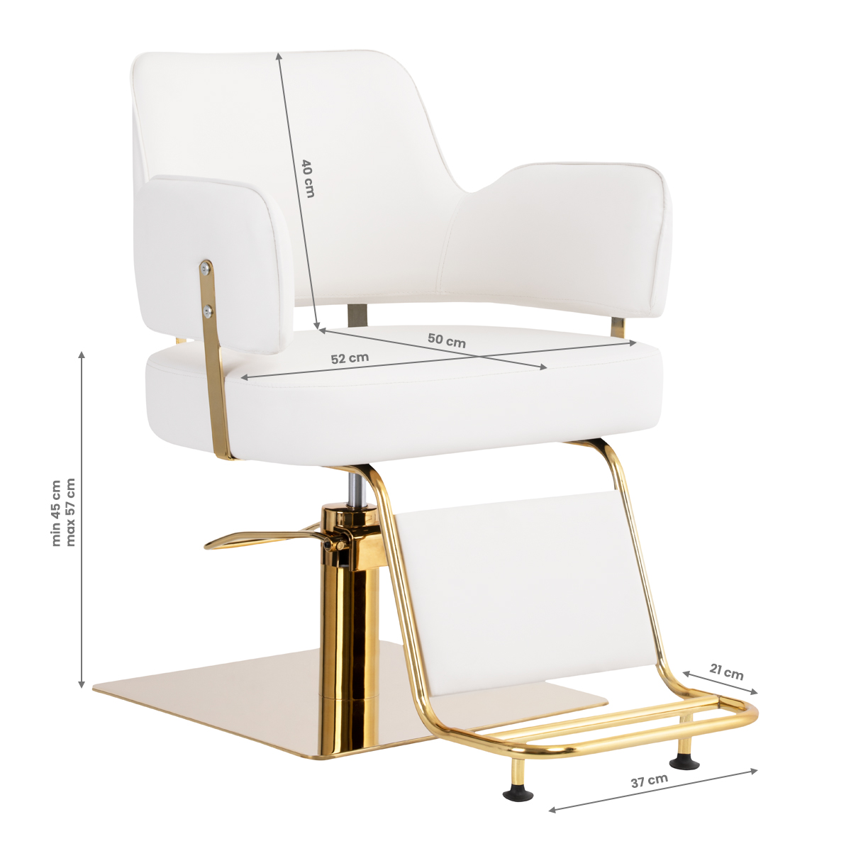 Een moderne kappersstoel ontmoette een voetsteun voldaan aan een uniek ontwerp. Zeer comfortabel, ideaal geschikt voor moderne salons. Speciaal gevormd om de cliënt een comfortabele positie tijdens de behandeling te bieden. Verstelbaar in het verticale vlak. Zeer stabiel en solide. Cover gemaakt van hoogwaardige eco-leer. Wit Color ontmoette Gouden -elementen.
