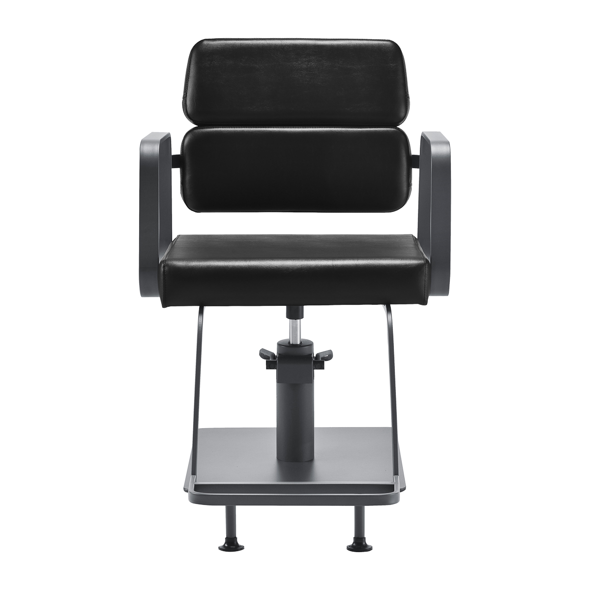Het volledige rotatiemechanisme van de stoel maakt het werk van de kapper effectiever en comfortabeler. Een solide, vlakke, vierkante basis garandeert stabiliteit tijdens gebruik. Het matte, gladde oppervlak geeft het element een elegante uitstraling en maakt het gemakkelijk schoon te houden. Een comfortabele zitting met schuimvulling zorgt voor een hoog gebruikscomfort, zelfs tijdens vele uren behandeling. Geometrische, metalen armleuningen zorgen voor de juiste positionering van de schouders van de klant – dit betekent dat hij zijn hoofd niet in zijn schouders steekt of onderuitgezakt zit – wat het veel gemakkelijker maakt om precieze behandelingen uit te voeren, inclusief knippen. Een stijlvolle voetensteun, speciaal voor dit model, biedt stabiele ondersteuning voor de voeten van de gebruiker.