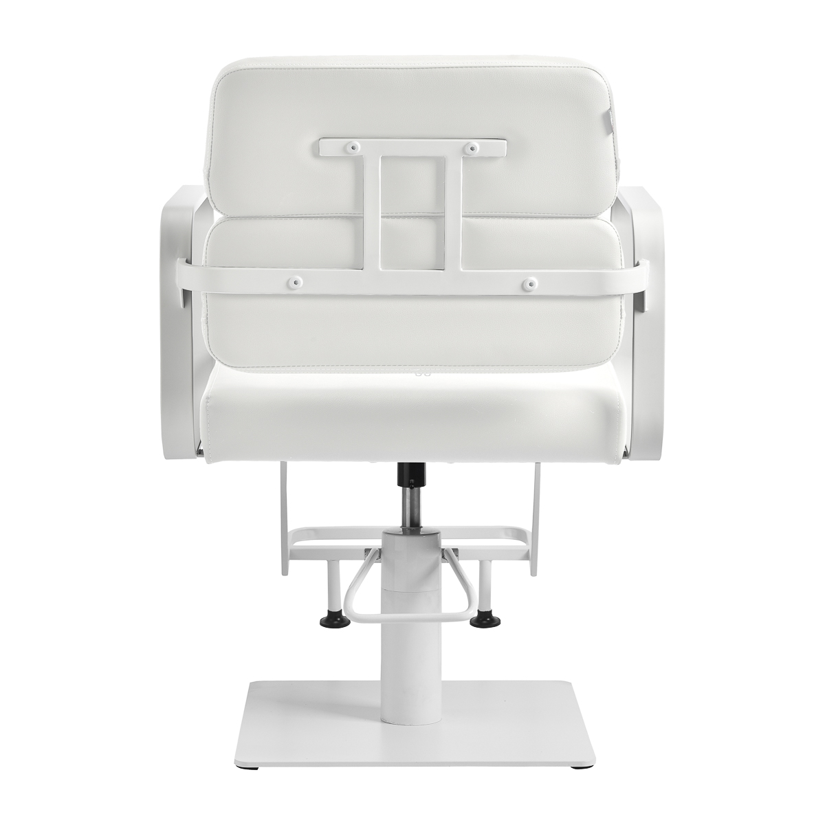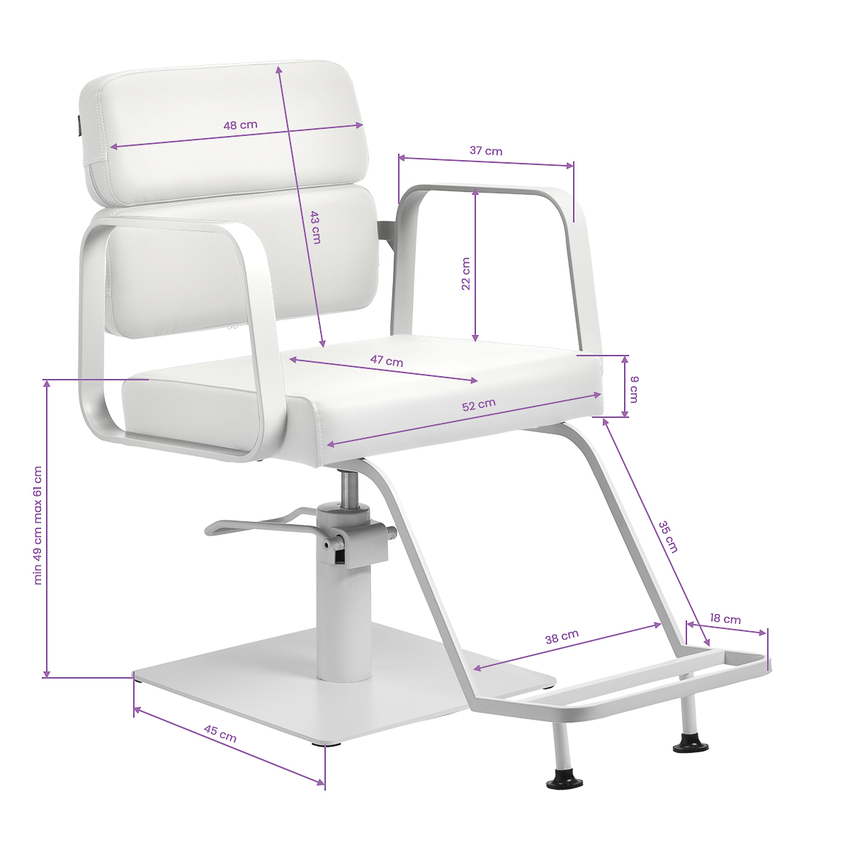 Het volledige rotatiemechanisme van de stoel maakt het werk van de kapper effectiever en comfortabeler. Een solide, vlakke, vierkante basis garandeert stabiliteit tijdens gebruik. Het matte, gladde oppervlak geeft het element een elegante uitstraling en maakt het gemakkelijk schoon te houden. Een comfortabele zitting met schuimvulling zorgt voor een hoog gebruikscomfort, zelfs tijdens vele uren behandeling. Geometrische, metalen armleuningen zorgen voor de juiste positionering van de schouders van de klant – dit betekent dat hij zijn hoofd niet in zijn schouders steekt of onderuitgezakt zit – wat het veel gemakkelijker maakt om precieze behandelingen uit te voeren, inclusief knippen. Een stijlvolle voetensteun, speciaal voor dit model, biedt stabiele ondersteuning voor de voeten van de gebruiker.