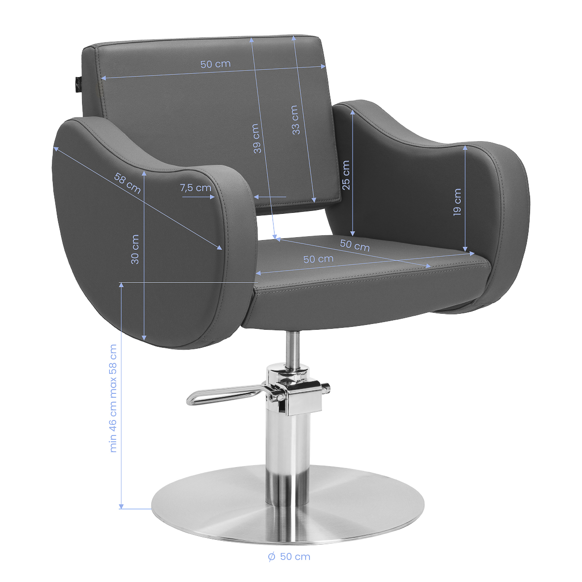 De robuuste hydraulische lift zorgt voor een soepele zithoogteverstelling van 46 tot 58 cm – zelfs wanneer de klant in de stoel zit. Deze praktische oplossing maakt het gemakkelijk om de positie aan te passen aan de lengte van zowel de klant als de stylist, wat ergonomisch werken bevordert. De geprofileerde rugleuning zorgt voor een comfortabele houding en stabiele rugondersteuning, wat vooral belangrijk is tijdens langere behandelingen. Een bijkomend voordeel is het volledige rotatiemechanisme, dat de bewegingsvrijheid vergroot en de klant van alle kanten toegang biedt.
