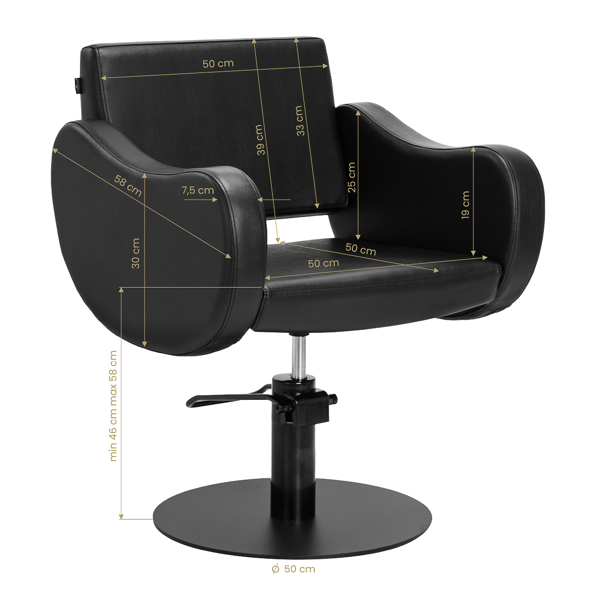 De robuuste hydraulische lift zorgt voor een soepele zithoogteverstelling van 46 tot 58 cm – zelfs wanneer de klant in de stoel zit. Deze praktische oplossing maakt het gemakkelijk om de positie aan te passen aan de lengte van zowel de klant als de stylist, wat ergonomisch werken bevordert. De geprofileerde rugleuning zorgt voor een comfortabele houding en stabiele rugondersteuning, wat vooral belangrijk is tijdens langere behandelingen. Een bijkomend voordeel is het volledige rotatiemechanisme, dat de bewegingsvrijheid vergroot en de klant van alle kanten toegang biedt.