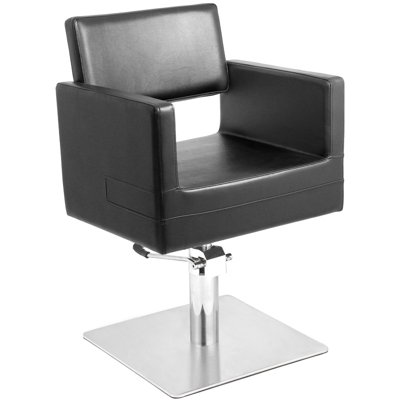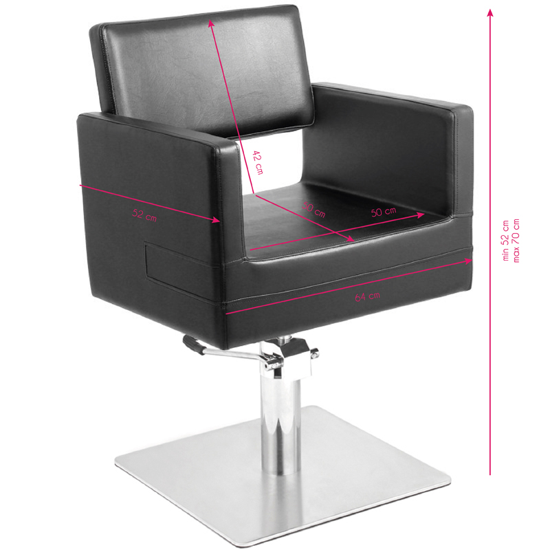 een elegante kappersstoel met een modern design. perfect gevormd en aangepast aan de vorm van het lichaam. De hoogwaardige afwerking wordt verzekerd door hoogwaardig, gemakkelijk schoon te maken, zwart ecoleer. de stoel heeft een hydraulische lift en een massief onderstel van hoogwaardig staal.
