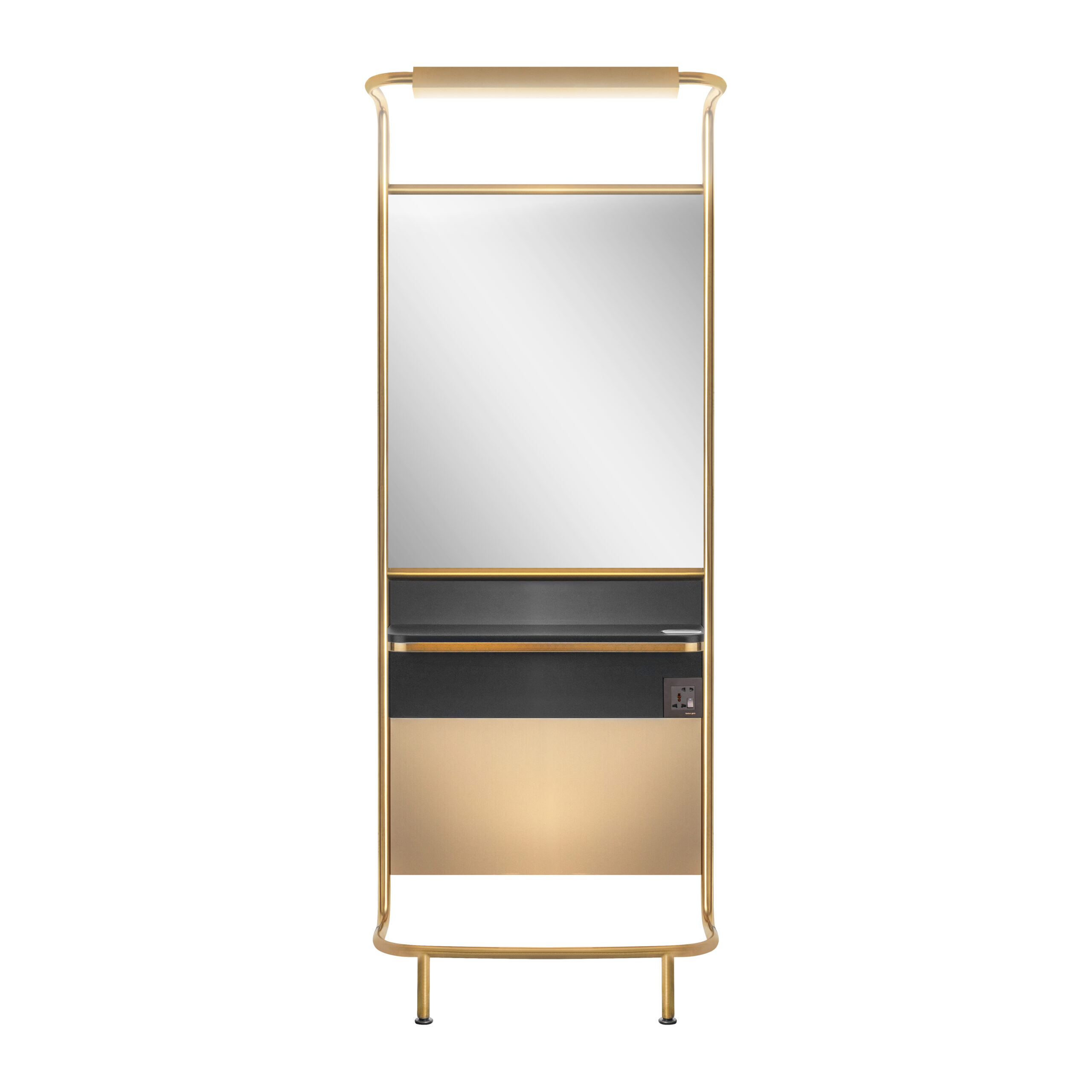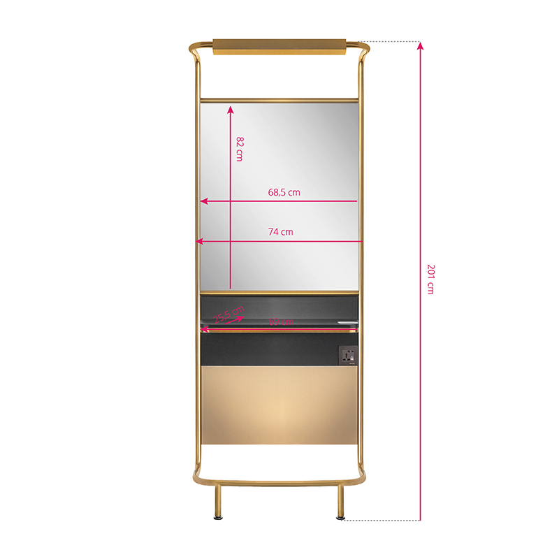 Een kaptafel is een van de belangrijkste apparaten in elke kapsalon. Het is de moeite waard om een meubel te kiezen dat niet alleen functioneel is, maar ook uw klanten zal verrassen en hen de sfeer van luxe zal laten voelen. We presenteren de nieuwe Gabbiano-console – de perfecte combinatie van modern design en bruikbaarheid. Het frame is gemaakt van verguld staal met een grote spiegel en een praktische plank. Een console die gewaardeerd zal worden door iedere eigenaar van een kapsalon.