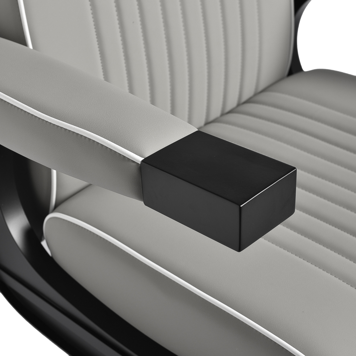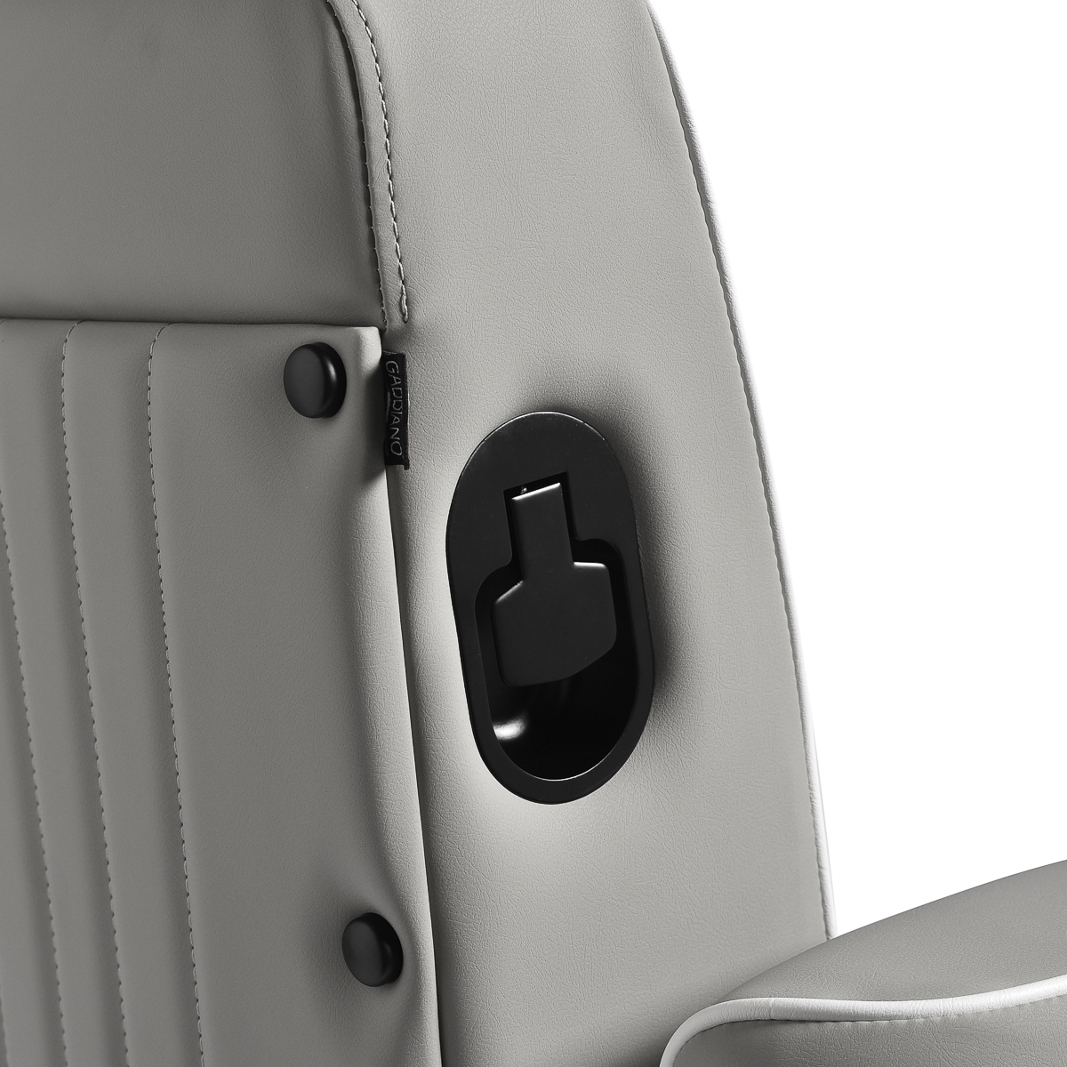 De zachte, matte bekleding van synthetisch leer combineert comfort met duurzaamheid. De gebruikte materialen zijn vochtbestendig, duurzaam en gemakkelijk schoon te maken. Stijlvol stikwerk en grijstinten geven het een uniek karakter en passen perfect bij de inrichting van moderne kapperszaken.
