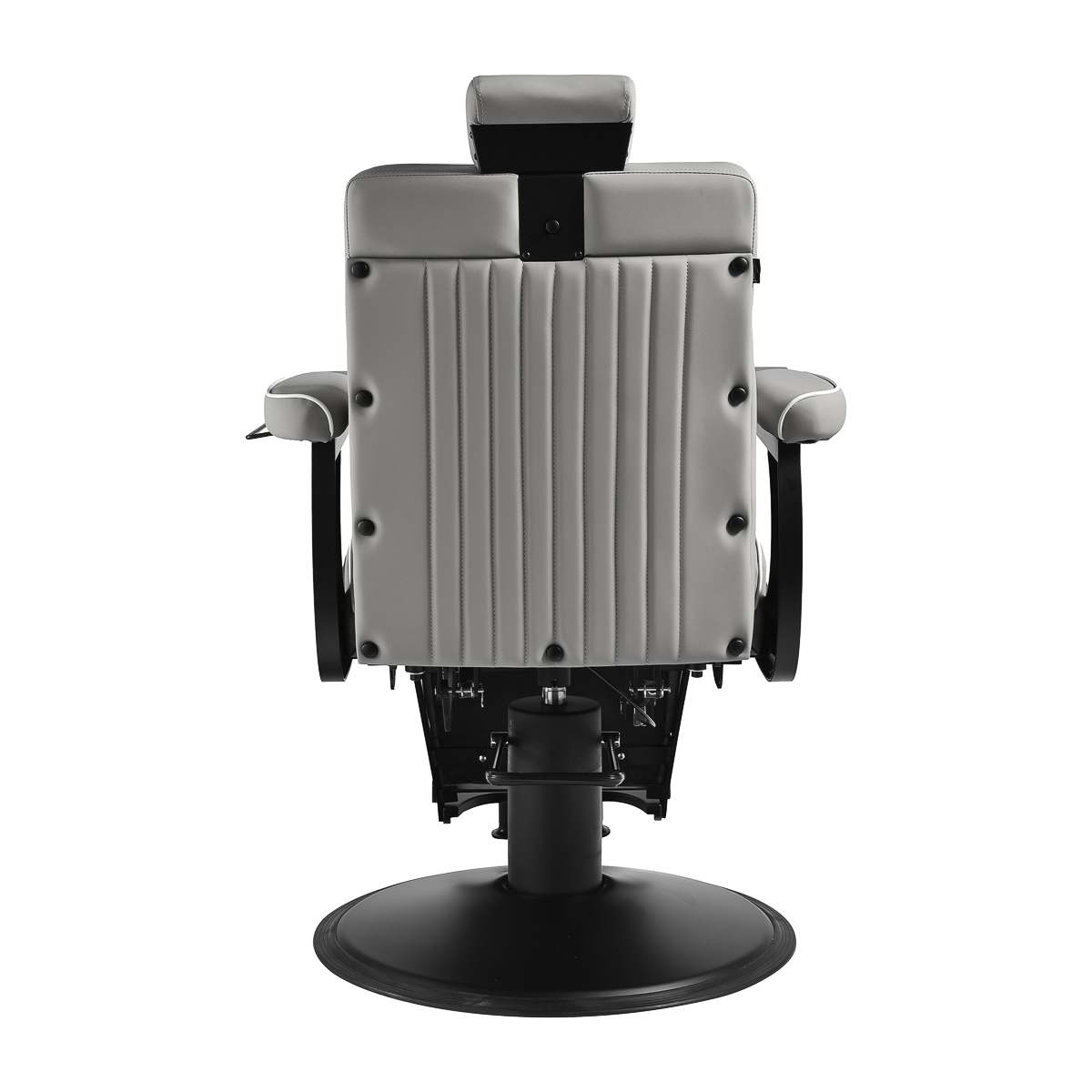 De Gabbiano Levi barberstoel met zwart frame en grijze stiksels aan de achterkant. is een betaalbare oplossing voor iedere professionele salon of praktijk. De levertijd is ongeveer 6 werkdagen.