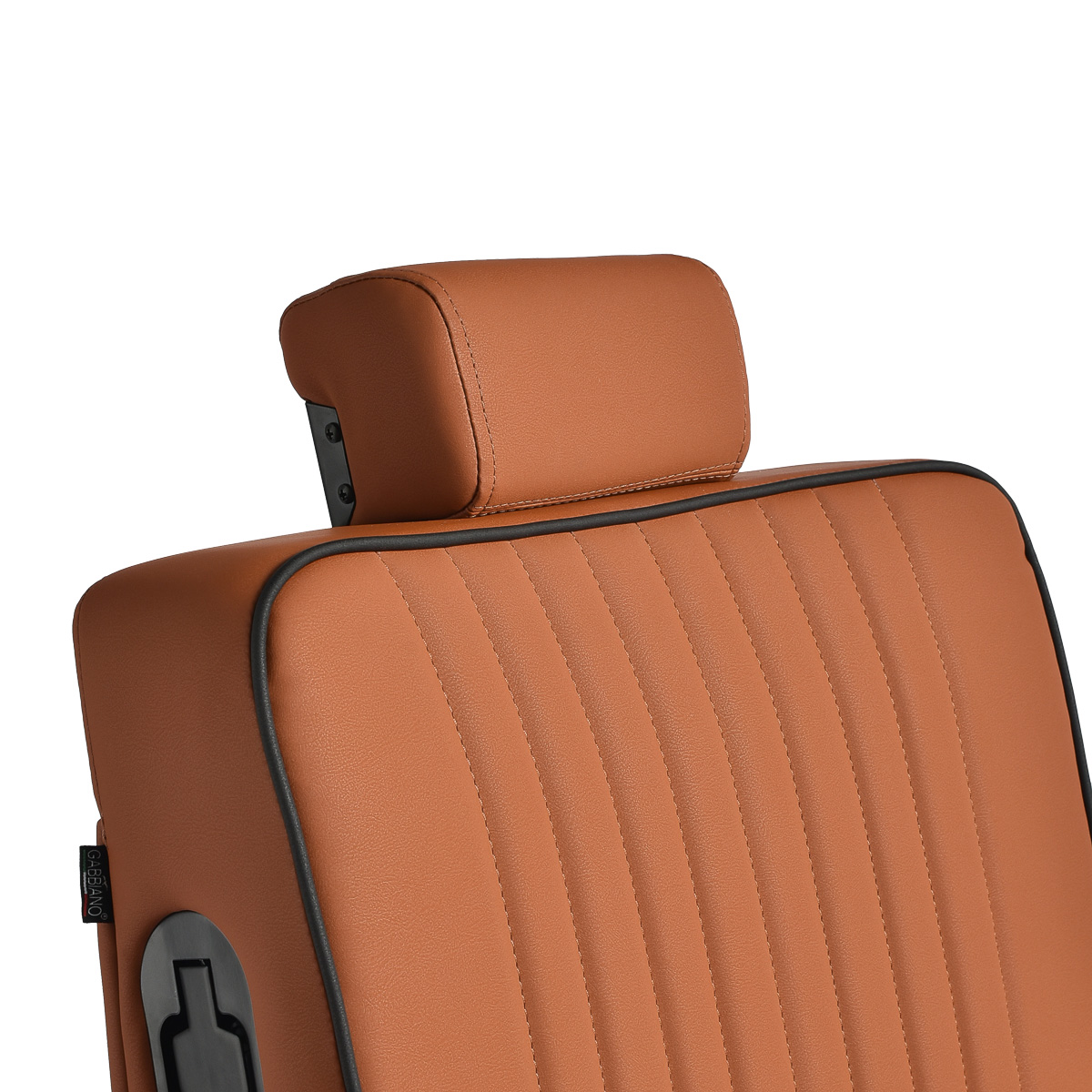 De zwarte, ronde voet zorgt voor stabiliteit en duurzaamheid. De zachte, matte kunstleren bekleding combineert comfort met duurzaamheid. De gebruikte materialen zijn vochtbestendig, duurzaam en gemakkelijk schoon te maken. Stijlvolle stiksels en de bruine bekleding geven de kapsalon een uniek karakter, wat perfect past bij de inrichting van moderne kapsalons. De combinatie van de elegante kleur van de bekleding met het zwarte frame en onderstel benadrukt de moderne, professionele uitstraling van de behandelstoel.