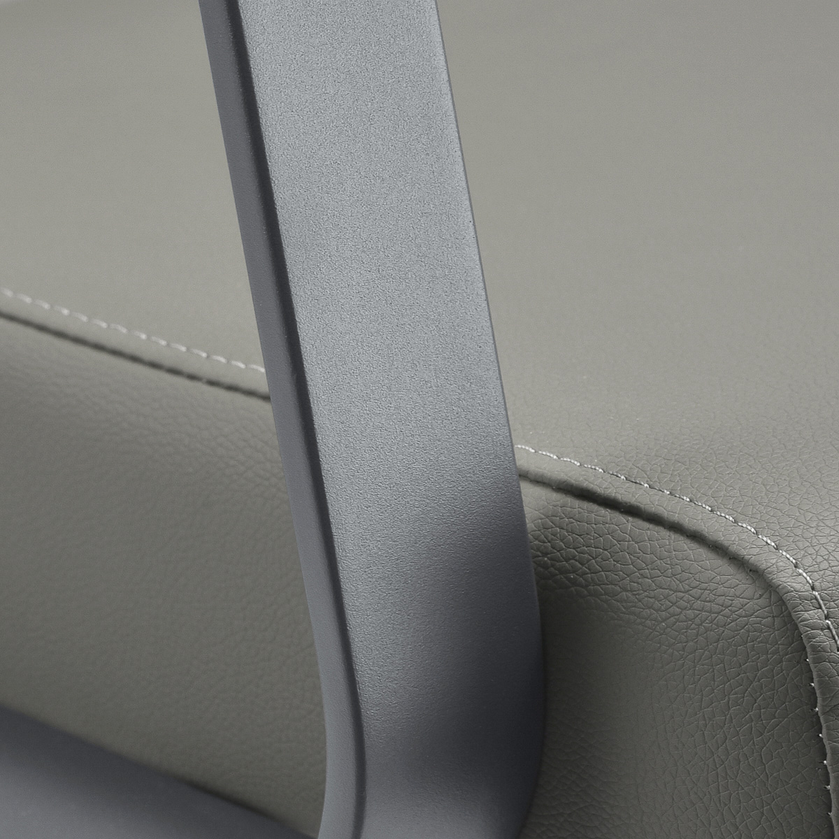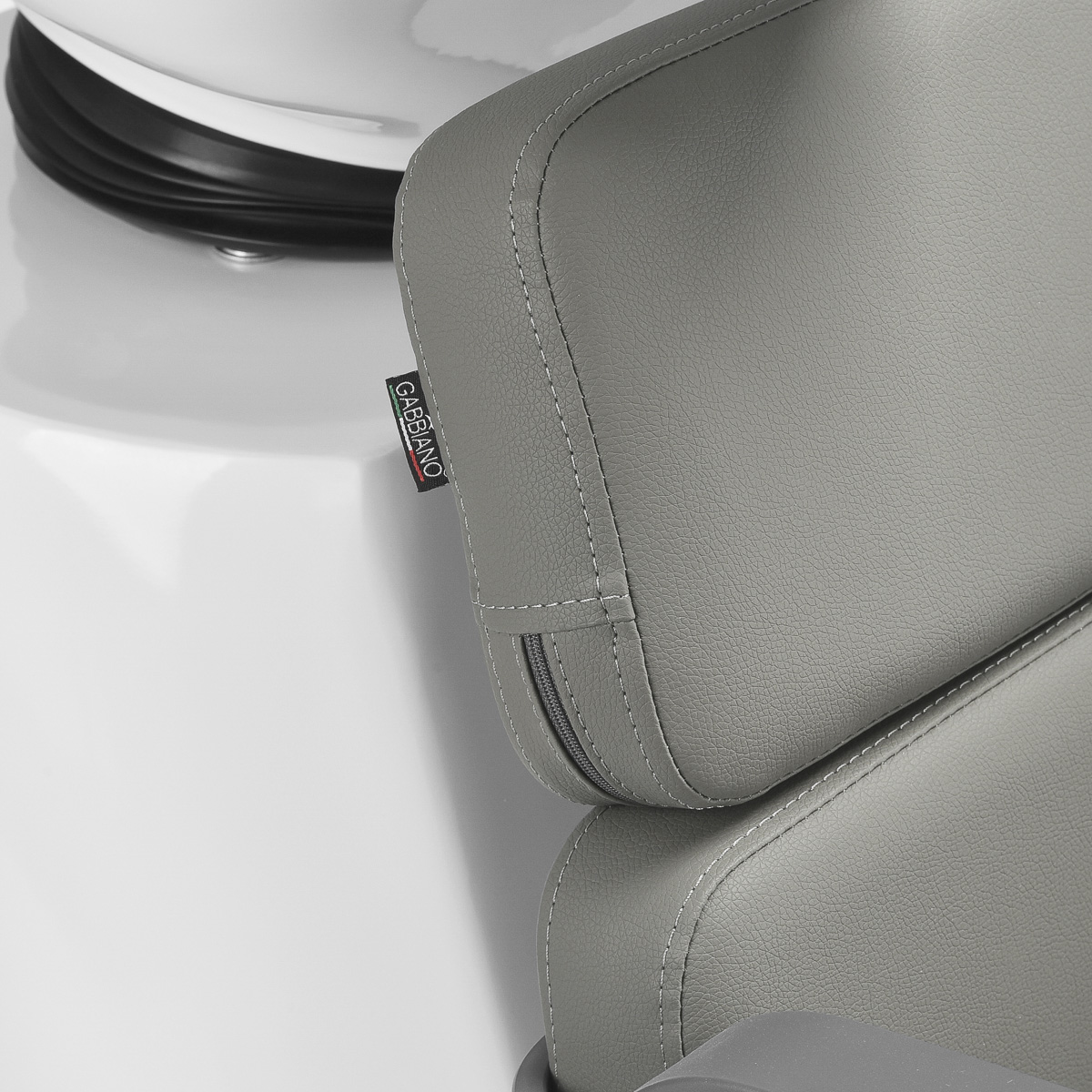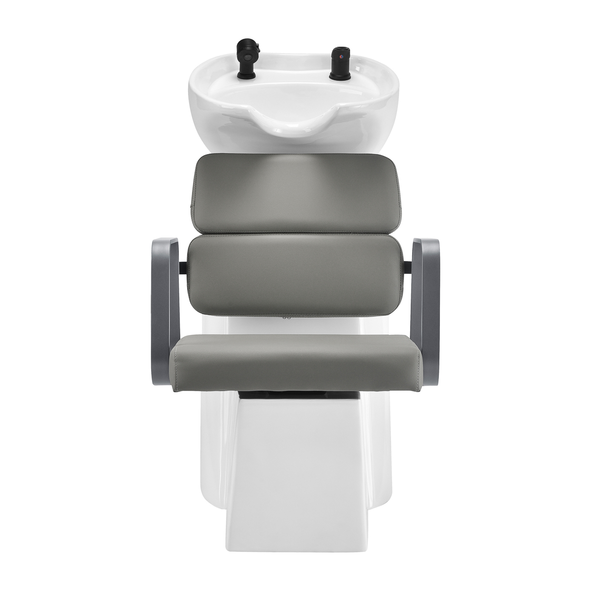 De geprofileerde behandelstoel biedt voldoende lendensteun en daardoor een hoog gebruikscomfort. Metalen armleuningen in grijstinten met een geometrische vorm zorgen voor een goede positionering van de schouders van de klant. De vulling met duurzaam, vormvast schuim en de bekleding van aangenaam aanvoelend kunstleer in grijstinten garanderen de duurzaamheid van het meubel, het reinigingsgemak en het comfortabele gebruik gedurende lange tijd. De originele, elegante uitstraling van de wasunit kappers geeft het interieur een unieke uitstraling. De set bevat complete accessoires in zwarttinten, inclusief een kraan, een douchekop en speciale slangen, voor een complete set gereedschap.