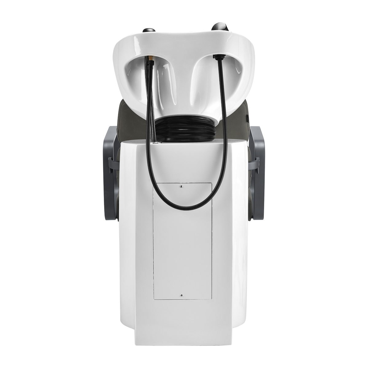 De juiste diepte van de witte keramische wastafelkom voorkomt overmatig spetteren van water of producten die tijdens de behandeling worden gebruikt. Dit zorgt voor comfortabele en effectieve uitvoering van een breed scala aan behandelingen. De hoek van de kom is verstelbaar, waardoor deze eenvoudig aan te passen is aan individuele behoeften. De hoge kwaliteit van de gebruikte materialen maakt de wastafel duurzaam, bestand tegen verkleuring en krassen, en zeer eenvoudig schoon te maken. Een goed gevormde kraag en schuine rugleuning bieden ondersteuning en comfort tijdens het wassen van het haar. Dankzij de comfortabele zwarte kunststof overlay voelt de klant geen enkel koud keramisch oppervlak.