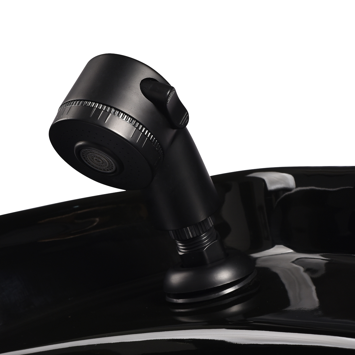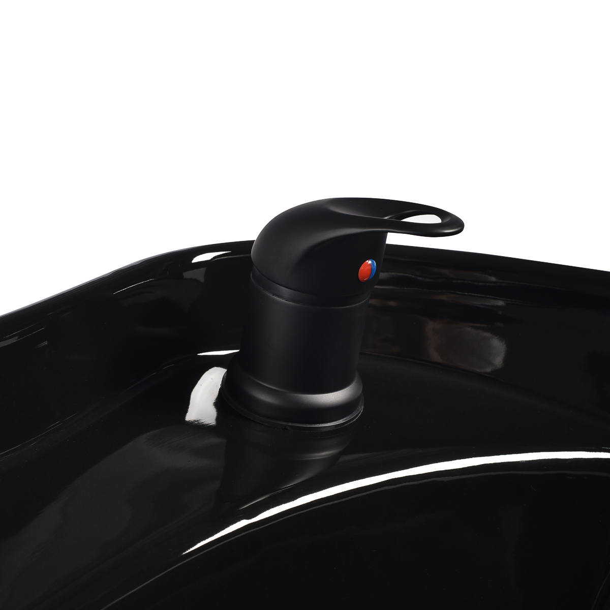 De juiste diepte van de witte keramische wastafelkom voorkomt overmatig spetteren van water of producten die tijdens de behandeling worden gebruikt. Dit zorgt voor comfortabele en effectieve uitvoering van een breed scala aan behandelingen. De hoek van de kom is verstelbaar, waardoor deze eenvoudig aan te passen is aan individuele behoeften. De hoge kwaliteit van de gebruikte materialen maakt de wastafel duurzaam, bestand tegen verkleuring en krassen, en zeer eenvoudig schoon te maken. Een goed gevormde kraag en schuine rugleuning bieden ondersteuning en comfort tijdens het wassen van het haar. Dankzij de comfortabele zwarte kunststof overlay voelt de klant geen enkele onaangename koude keramische oppervlakte.