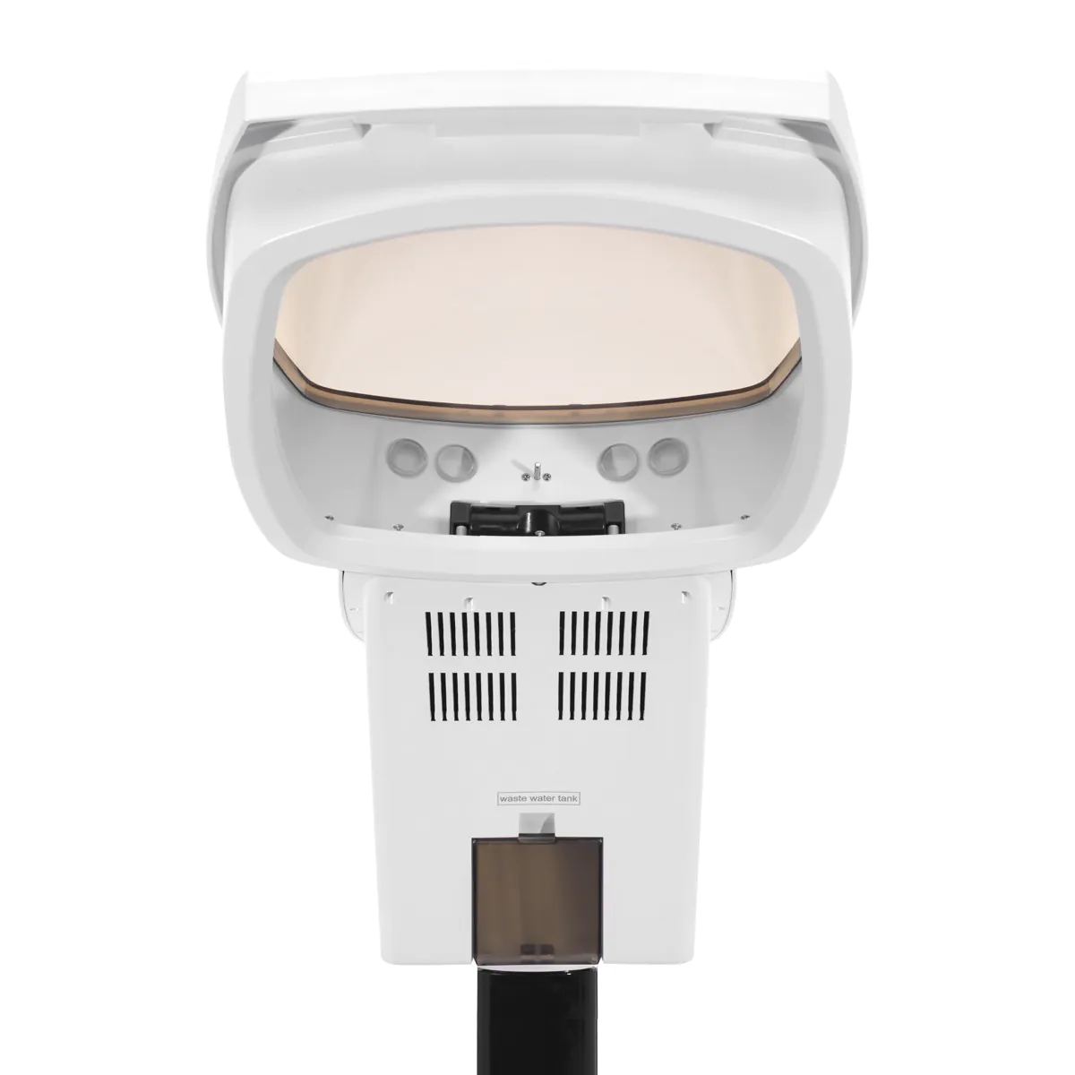 Het Het eenvoudig te gebruiken apparaat maakt gebruik van waterdamp, wat de opname van verzorgende stoffen vergemakkelijkt en het haar zacht en zeer gehydrateerd maakt. De warmte die vrijkomt uit de waterdamp stimuleert de microcirculatie van de hoofdhuid en faciliteert het transport van essentiële voedingsstoffen. Dit verhoogt het comfort en de tevredenheid van de cliënt die de behandeling ondergaat. Het gebruik van een dergelijke oplossing heeft ook een positief effect op de hoofdhuid en het haar wordt sterker en heeft minder de neiging uit te vallen. Het apparaat is voorzien van een tank met een inhoud van bijna twee liter voor schoon water en een kleinere opvangbak voor water dat condenseert tijdens behandelingen. De sauna isuitgerust met een systeem dat informeert over het gebrek aan water in de tank met een bericht op het scherm en een karakteristiek geluid. De set bevat ook een speciale pet met trekkoord, waardoor het gemakkelijker wordt om stoom op het haar te richten.