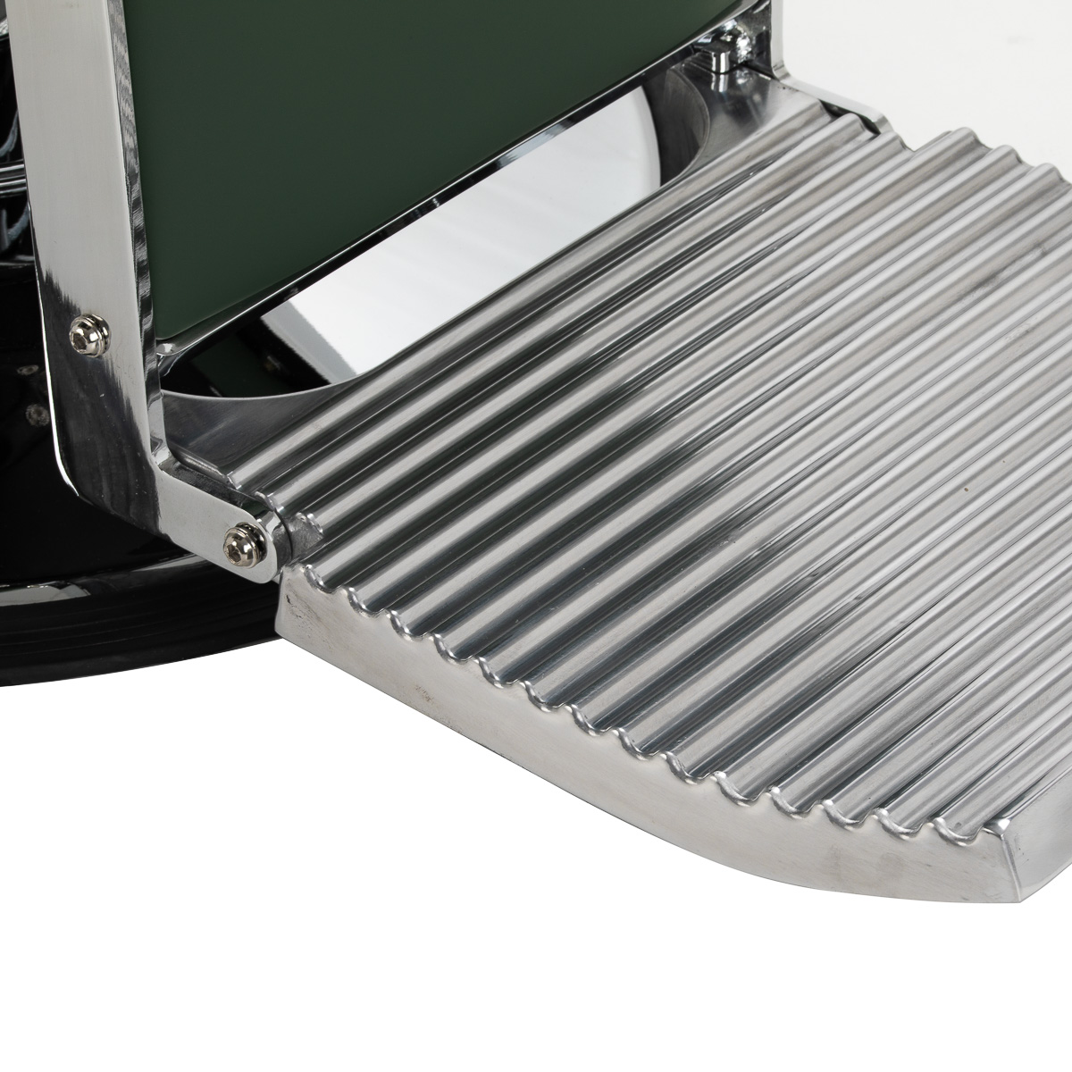 Stijlvolle stiksels en bekleding in groene tinten geven het een uniek karakter, waardoor het perfect past bij de inrichting van moderne kapperszaken.