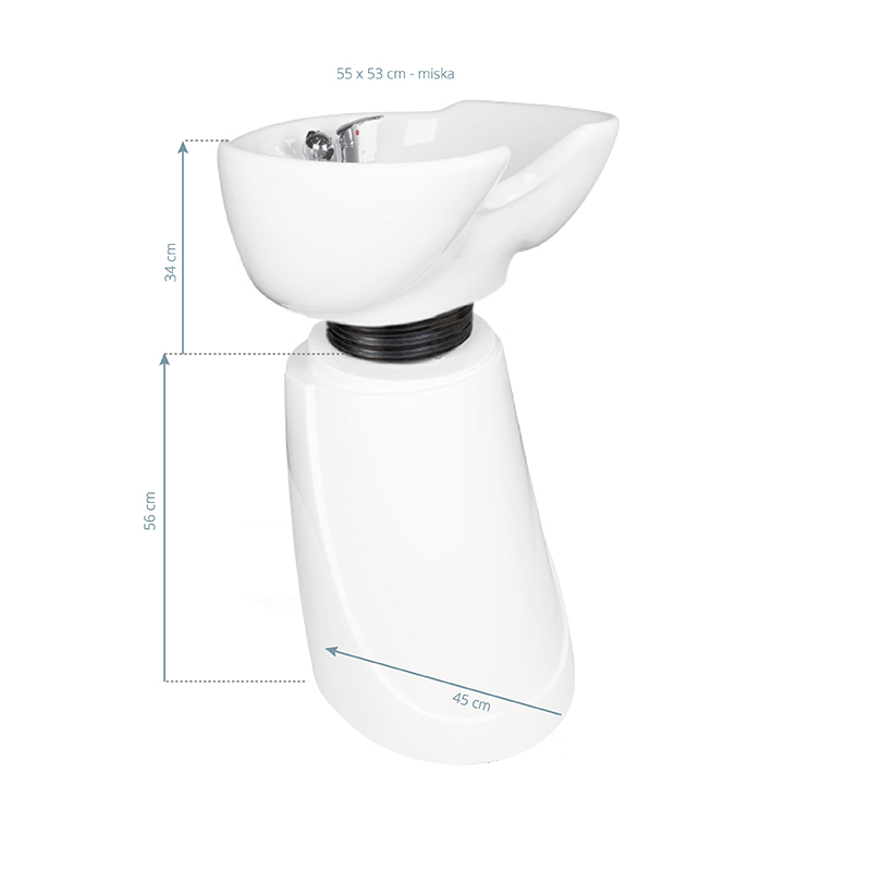 Moderne gabbiano kappers wasunit op zuil. Speciaal aanbevolen voor kleine salons waar vakkundig ruimtebeheer belangrijk is. Een perfect gevormde, keramische kom stelt de klant in staat zijn hoofd comfortabel te positioneren en te genieten van een van de meest aangename behandelingen in een kapsalon. De zuil waarop de schaal wordt geplaatst is gemaakt van acryl en sluit de wasunit aan op de vloer. Eenvoud en elegantie in één. De wasunit staat prachtig in kapsalons.