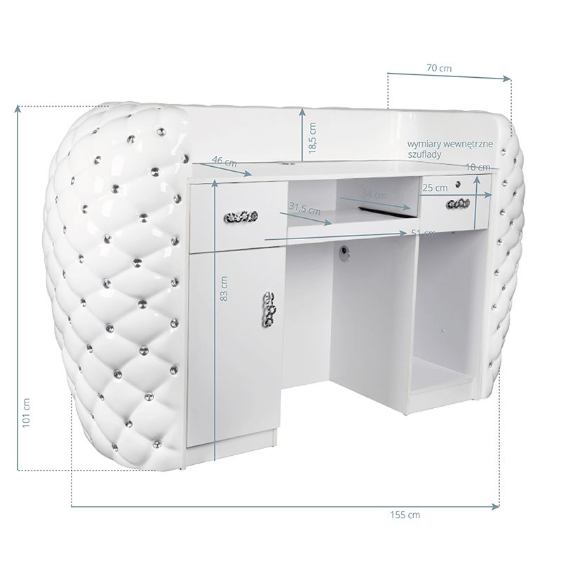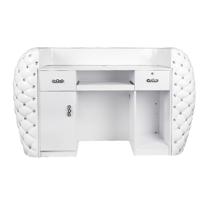 Gabbiano diamantontvangst is een voorstel voor de meest veeleisende klant. gemaakt van sterk glanzend acryl waarop decoratieve kristallen zijn geplaatst. ze creëren een uniek salon balieontwerp. de behuizing heeft een ronde vorm, is makkelijk schoon te maken. de salon balie heeft 2 zeer praktische, diepe lades. een van de bovenste lades is beveiligd met een sleutelslot en in het midden is er een uitschuifbare toetsenbordplank.. De planken zijn gemaakt van wit gelamineerd karton met een stevige afwerking. de salon baliebalie wordt een prachtige exclusieve toevoeging aan de woonkamer