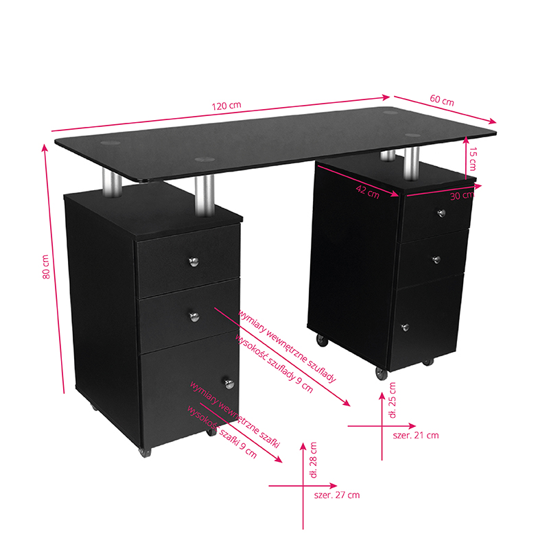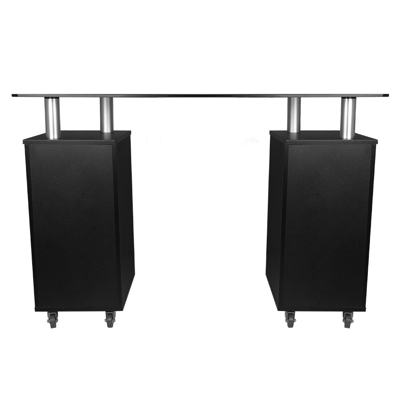 Functionele manicure tafel – perfect voor kantoren. Het is een meubelmeubilair, niet alleen functioneel, maar ook extreem elegant, die perfect bij de meubels van moderne kamers past. Het heeft twee kasten met ruime laden en planken. Dankzij maar liefst acht wielen is het meubilair stabiel en gemakkelijk te bewegen in kamers, zelfs wanneer het wordt geladen. Een toename van meerdere centimeter onder het tafelblad gemaakt van dik, gehard glas maakt de voorgestelde tabel perfect voor manicure-behandelingen.