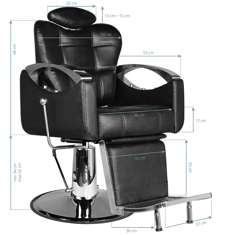 Klassieke barberstoel van Hair System. Elegant en zeer comfortabel. Een solide, chromen onderstel garandeert de stabiliteit van de zitting. Bekleding van hoogwaardig zwart eco-leer. De stoel heeft een verstelbare rugleuning met een hoofdsteun en in hoogte verstelbaar. De barberstoel wordt geleverd in delen voor zelfmontage.